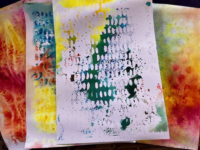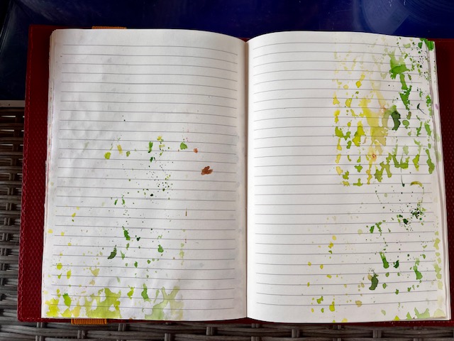 Here I started by playing with brushos and some of the fabulous new stencils. I sprinkled some Brusho powders on my craft mat, spritzed with water and put on the stencil. I did a first mop up with paper straight on this, then picked up the stencil and smooshed it on my journal page. You can continue using the colour left on the mat in various ways. I used a green/blue combination for the pages.