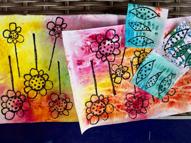 Next I stamped flowers on some orange/pink pages I had created and cut these out.