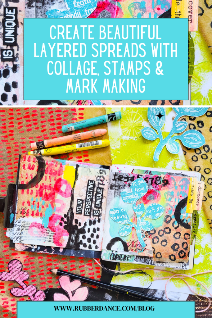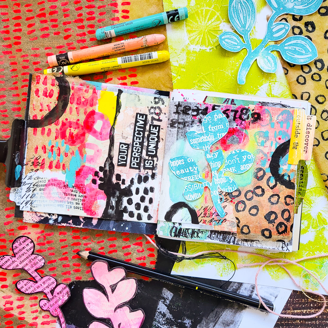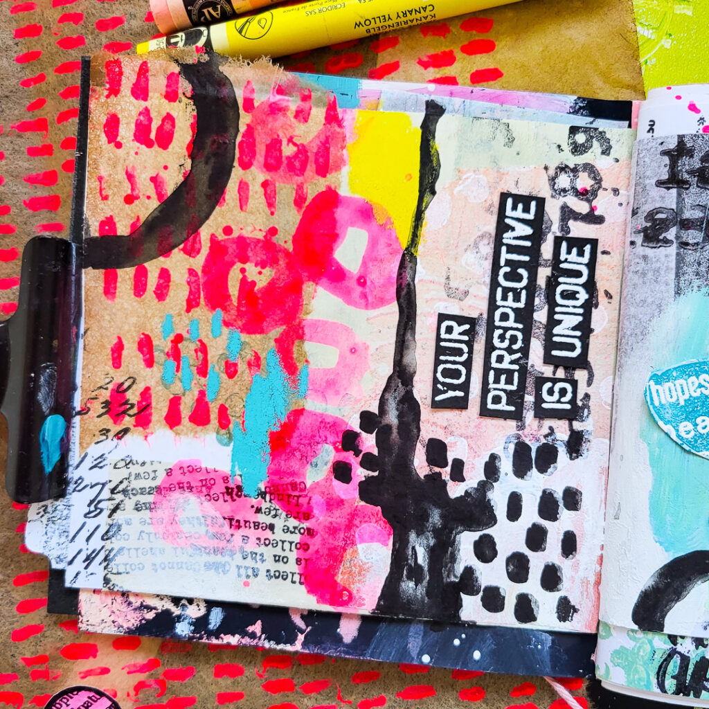 I started the background of this page with different collage papers such as gelli prints, stamped book paper and stamped rice-papers. I adhered the torn pieces with a glue stick and covered the whole spread with a layer of clear gesso. I am using acrylic inks after the gesso was dry to bring in colour. I love the neon pink together with the light blue! Once this was dry I added a little bit of background stamping with images from Mix It Up 1 and mark makings with Neocolor and my black Stabilo All pencil.