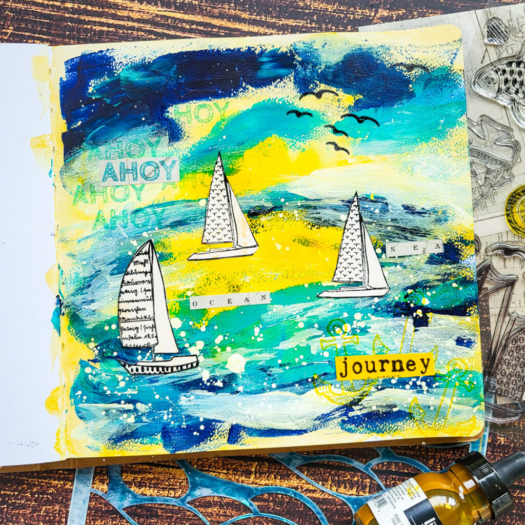Hi there, Susanne here with a nautical art journal page using our brand new AHOY stamp set! I used a combination of liquid watercolor and acrylic paints for the background. The boats are stamped to a light beige gelli print with some grungy textures going on.