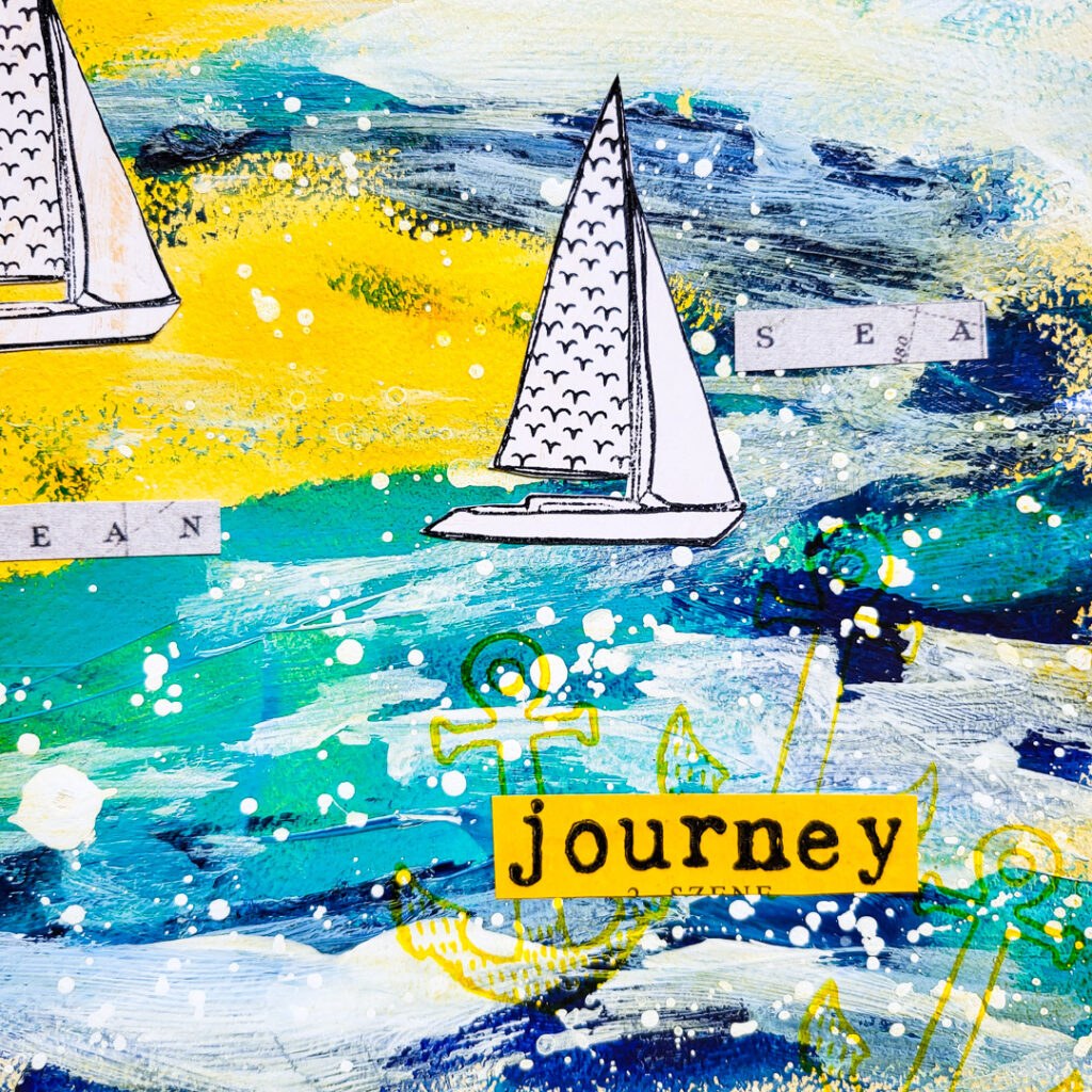 Whilst the page was drying I cut out my boats and stamped the word AHOY to a map design paper (from a DCVW paper pad). I also stamped the word “journey” from our Mix It Up 6 stamps set to a piece of an old book page that I coloured with some Indian Yellow acrylic paint. Additionally I cut out some more words from the map design paper.
