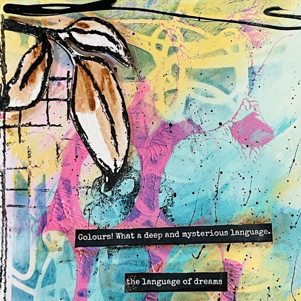 I started by applying acrylc paints thin to the pages. After the paint was dry, I stamped on the background with images from the Pencil Marks 4 stamp set. I then decorated my page further with the Big Ovals stencil, followed by the Scribbles 1 stencil. I decorated the edges with a piece of Mixed Media Borders. Finally I adhered the flower and leaf, which I coloured very lightly with watercolours.