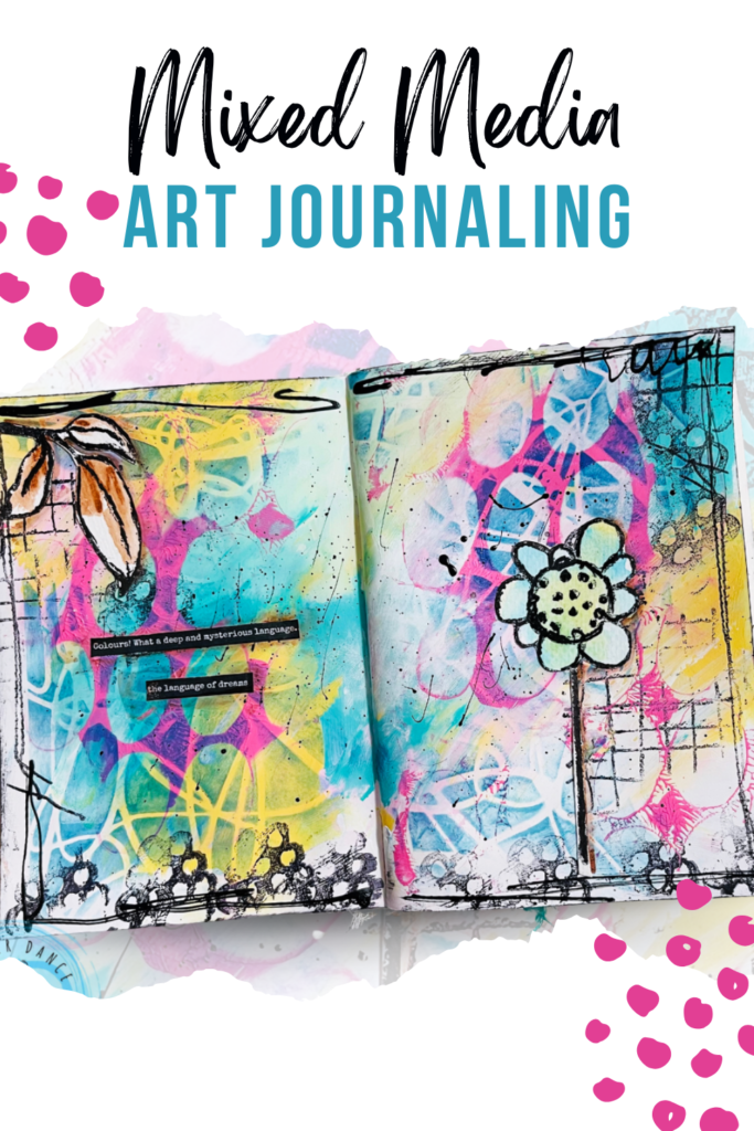 I started by applying acrylc paints thin to the pages. After the paint was dry, I stamped on the background with images from the Pencil Marks 4 stamp set. I then decorated my page further with the Big Ovals stencil, followed by the Scribbles 1 stencil. I decorated the edges with a piece of Mixed Media Borders. Finally I adhered the flower and leaf, which I coloured very lightly with watercolours.