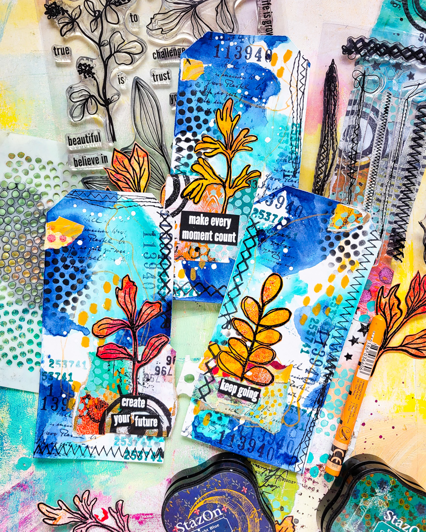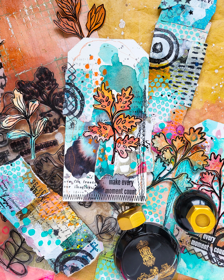 Hi there, Susanne here sharing a new video tutorial! I am creating a trio of mixed media tags with a loose and inky background using some of our Collage Leaves 2 and Collage Leaves 3 stamps as my focal point.