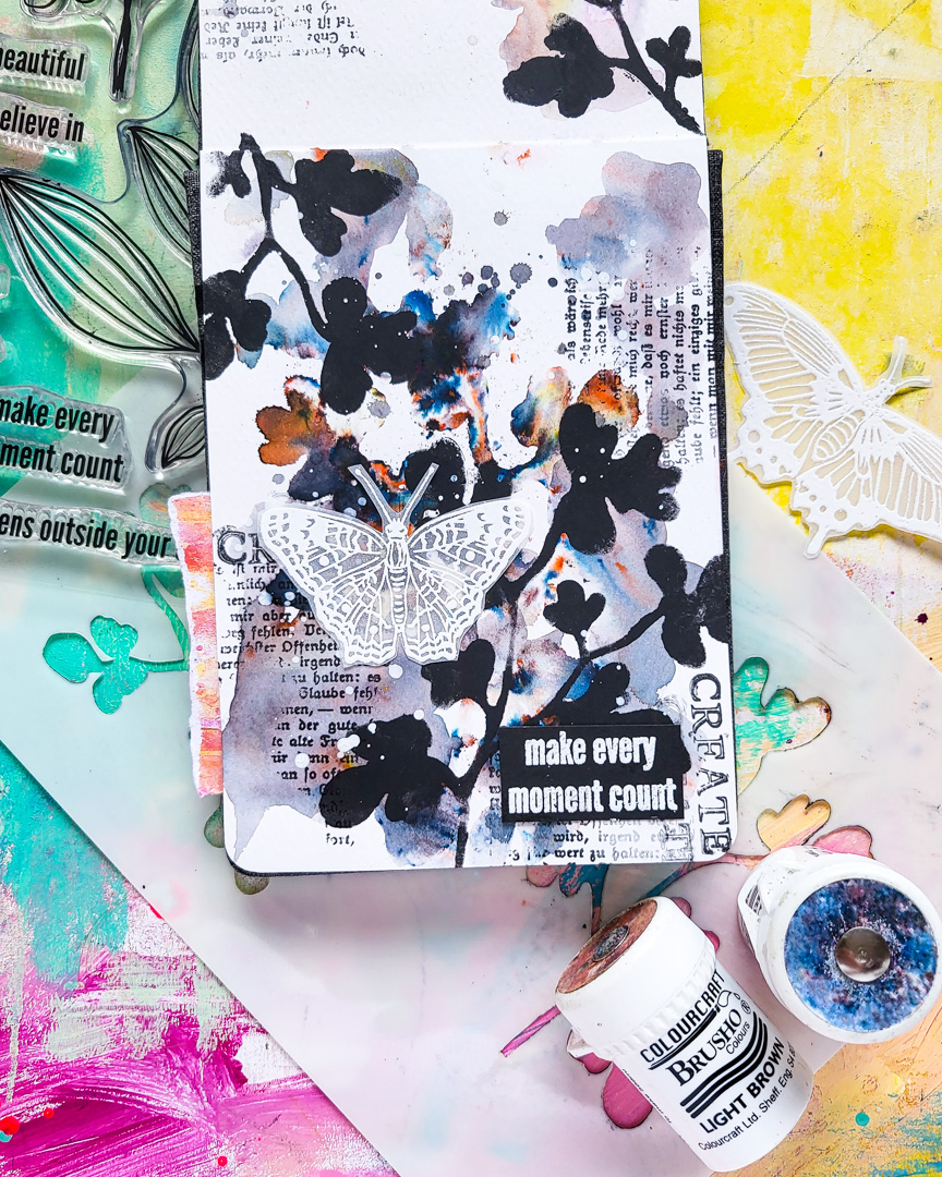 Hi there, Susanne here sharing a super easy art journal page using Brushos together with our Sketchy Leaves 7 stencil. I also use some stamps from Mix It Up 5 and Butterflies and Moths.
