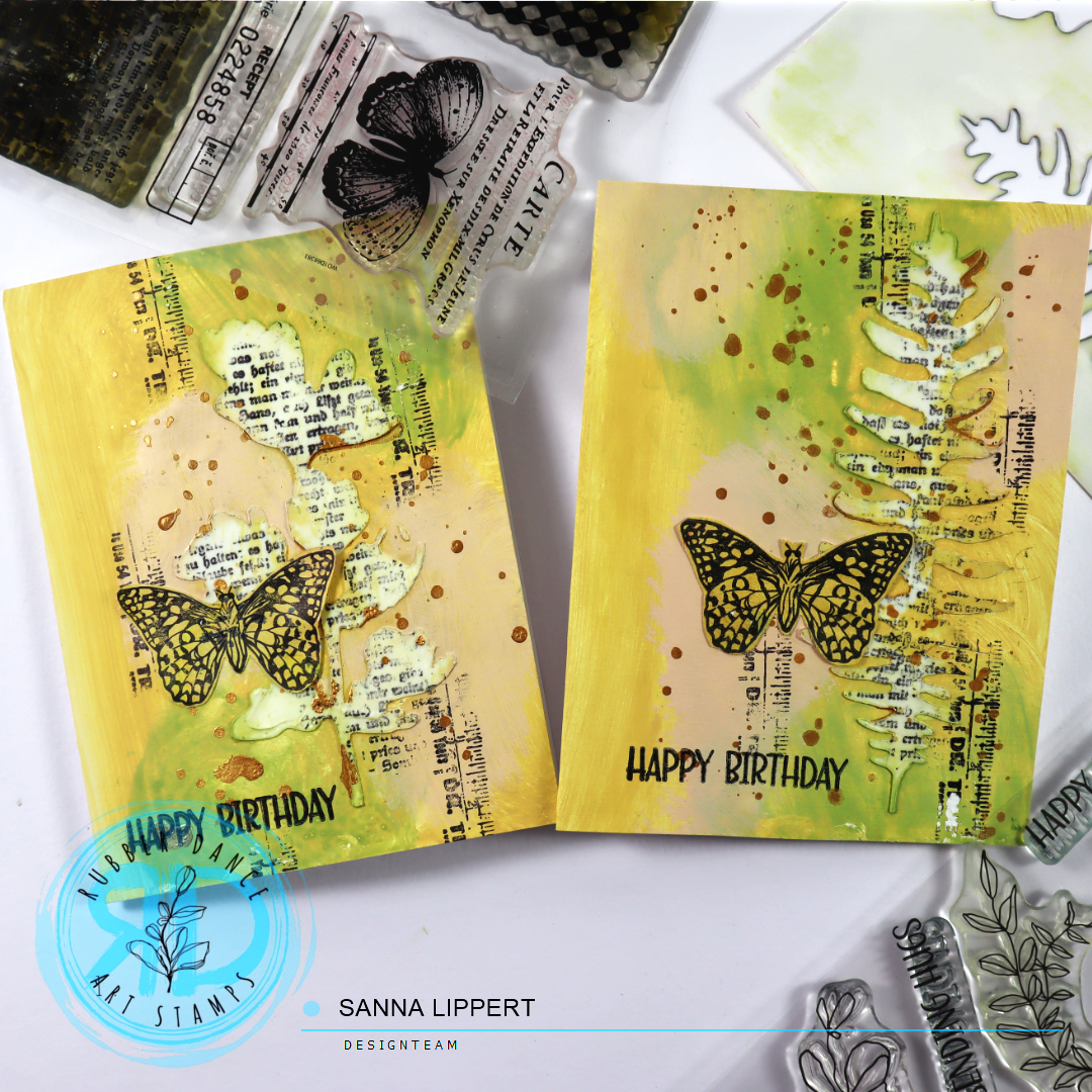 Hello, it´s Sanna here today with a set of Christmas cards. I used the Xmas Trees 2 and the Stars 1 stencil for these cards. The idea is very simple, you just need some gelli printed collage papers as a starting point.