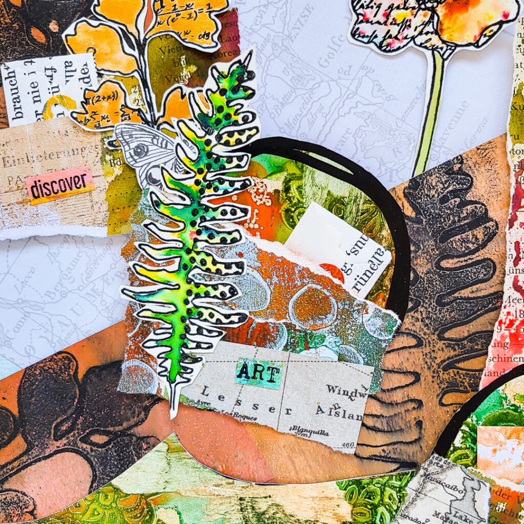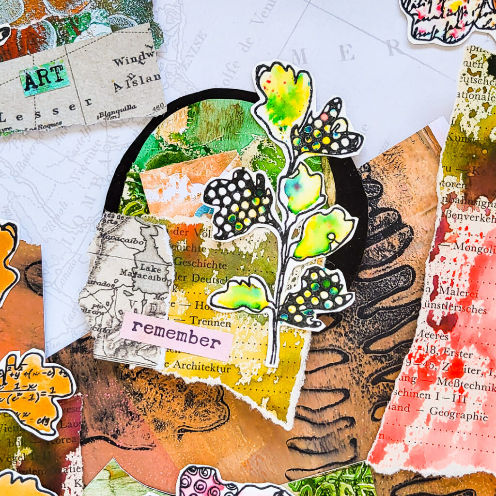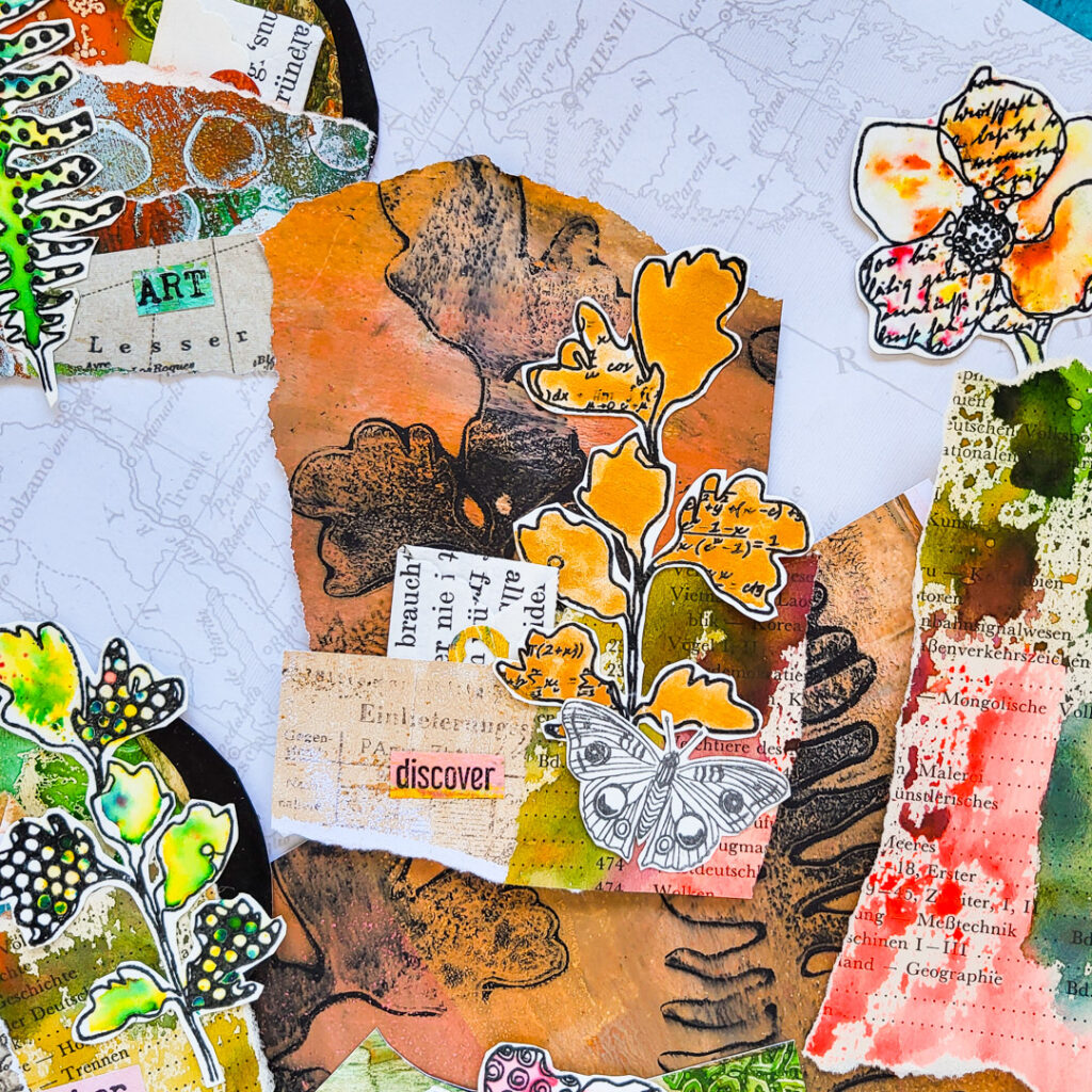 For today’s ephemera pieces I used stamped images from our Doodle Flowers 2 stamp set, which I had left over from another project. The papers are gelli prints and also from a design paper and an old book.