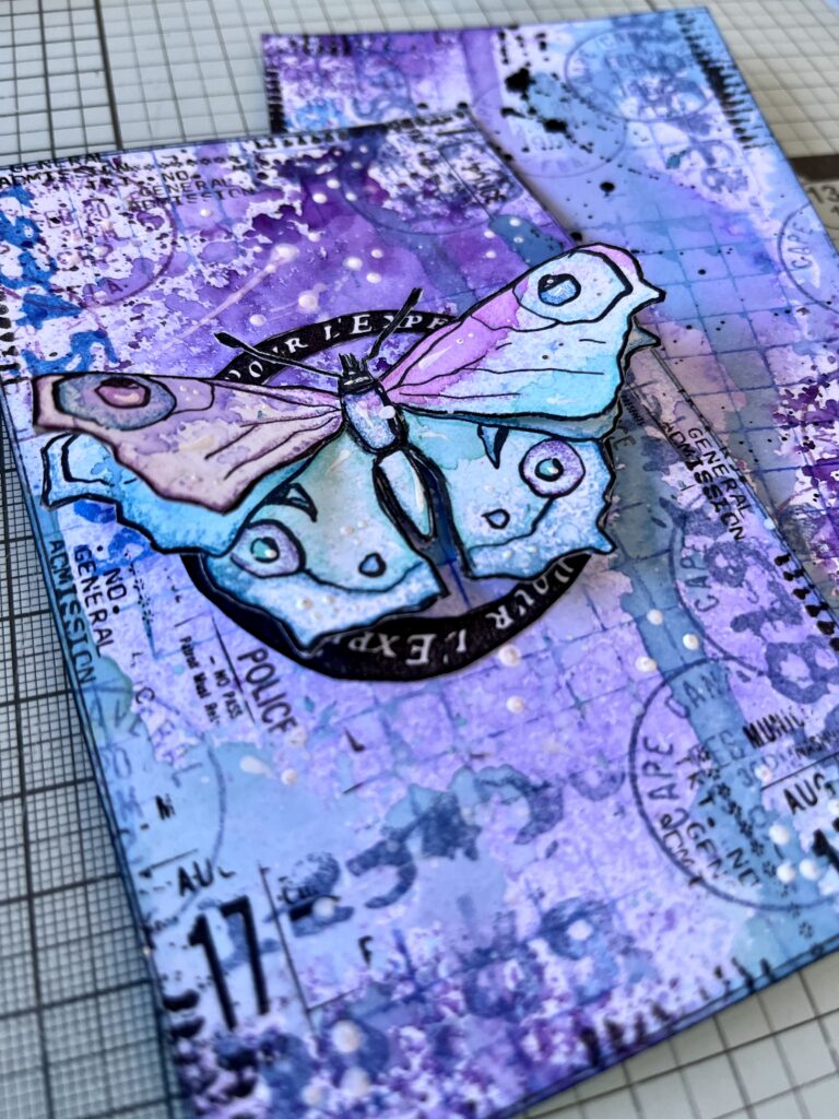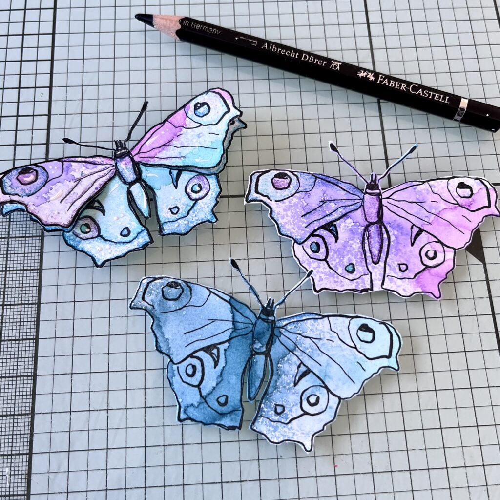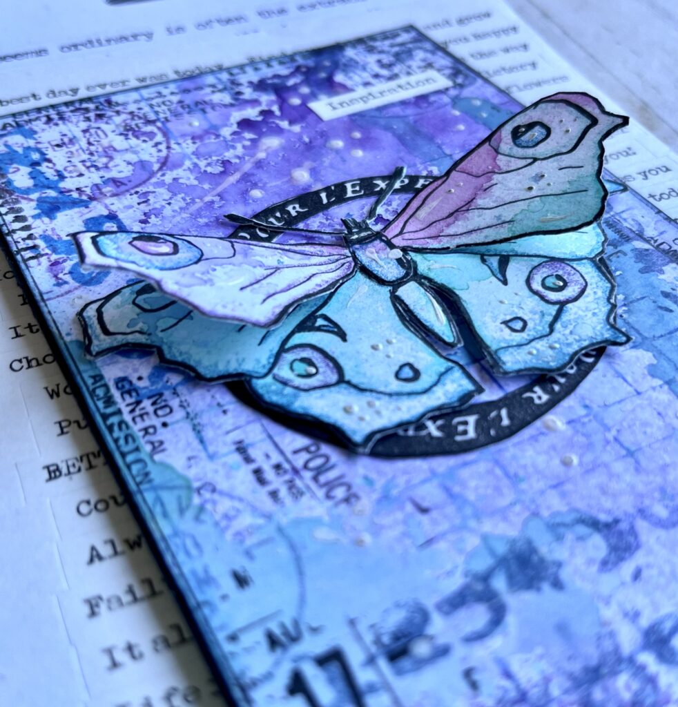 I stamp and color the butterfly, adding around it with black watercolor pencil to give it more depth.
