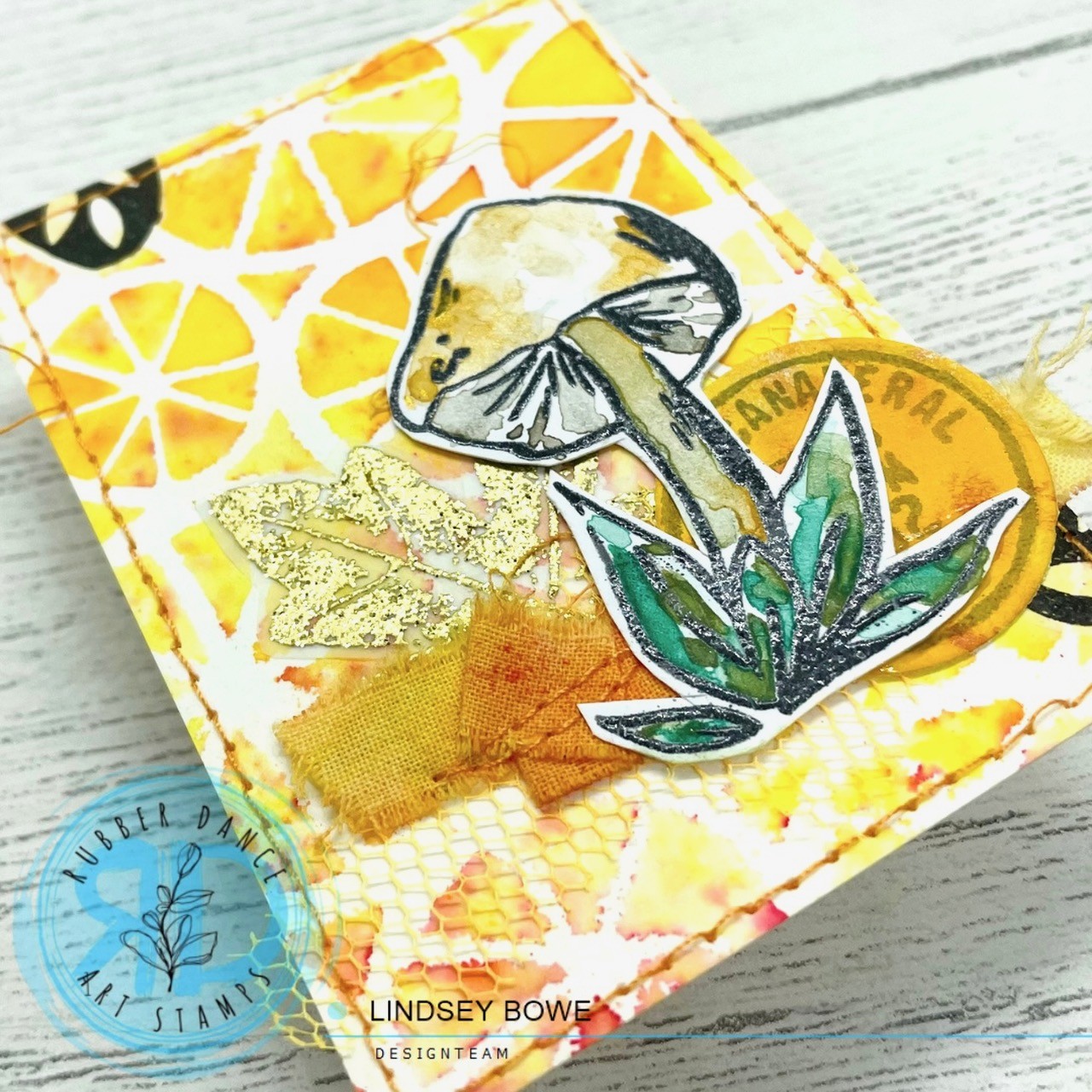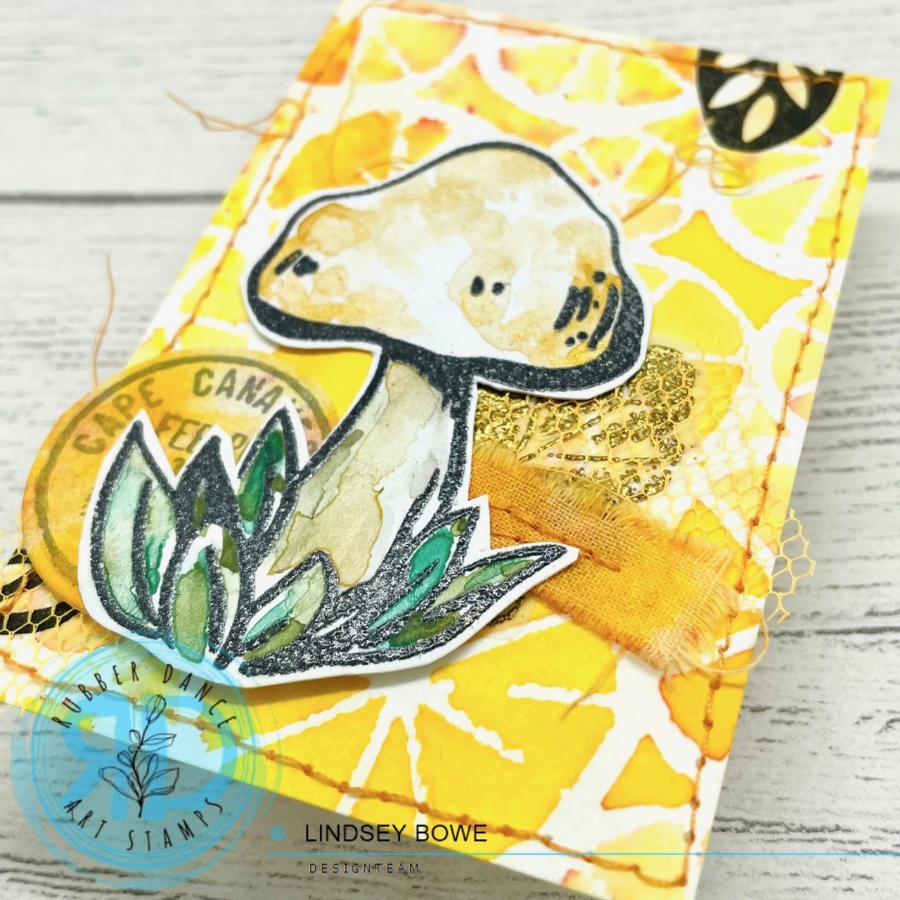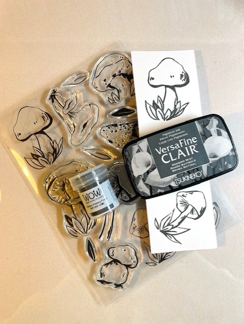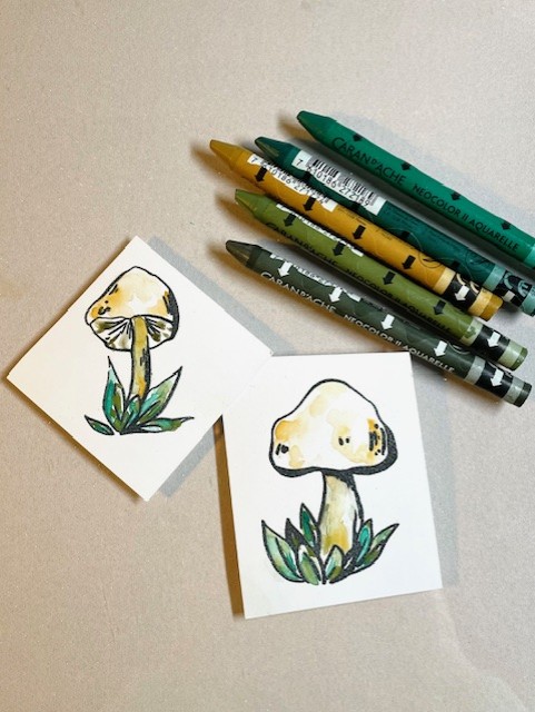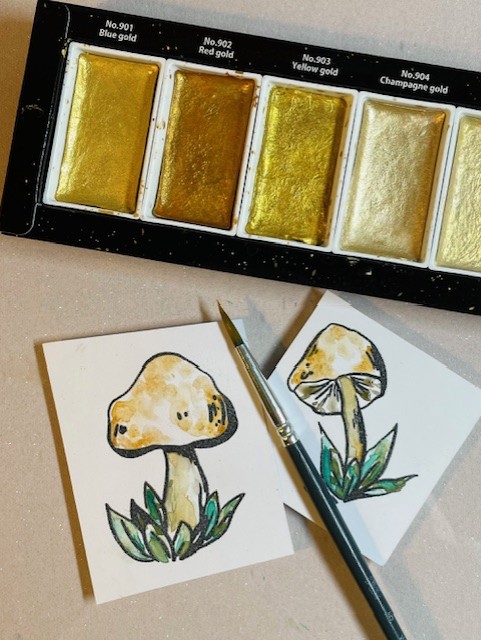 For my focal images, I stamped images from the Inky Mushrooms 1 set using VersaFine ink (waterproof) and water coloured them with Neocolor II crayons and metallic gold Gansai Tambi paints.