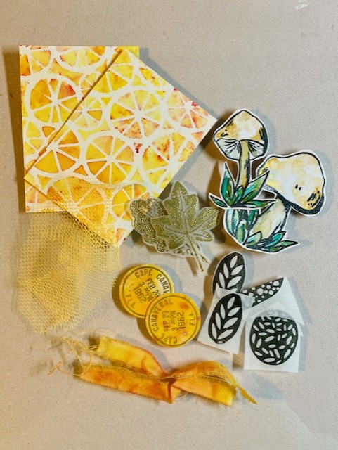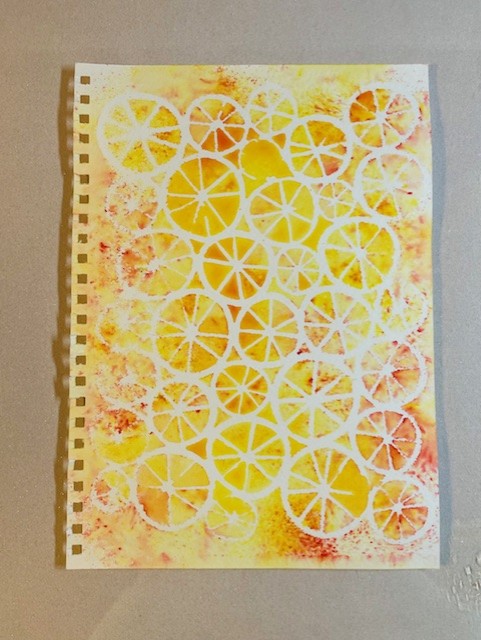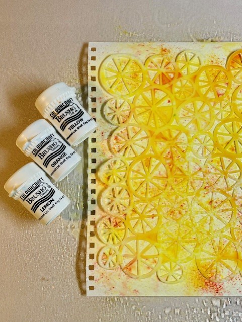 First for the background – I placed the Wheels stencil on a piece of watercolour paper, spritzed with water, then added liberal sprinklings of Brushos (pigment powders – other brands area available!). Reminds me of lemon and orange slices 😁