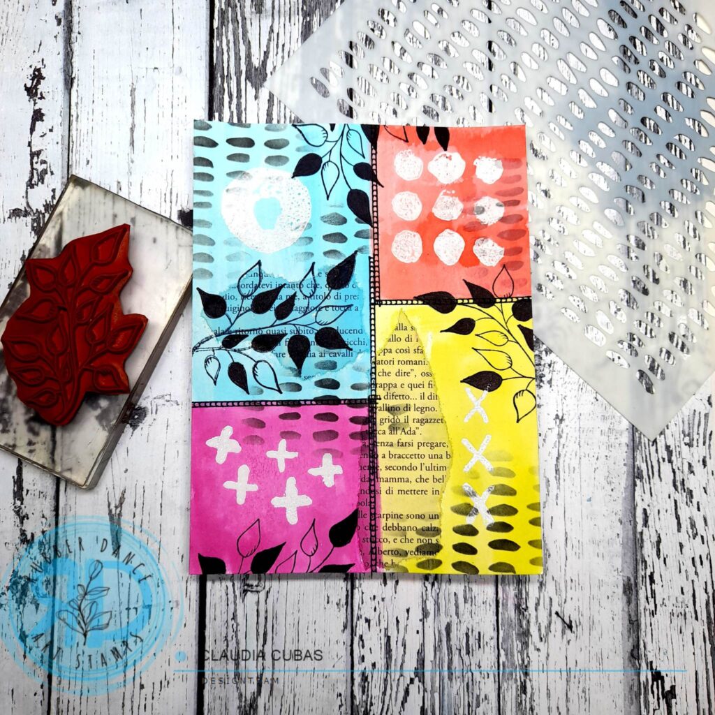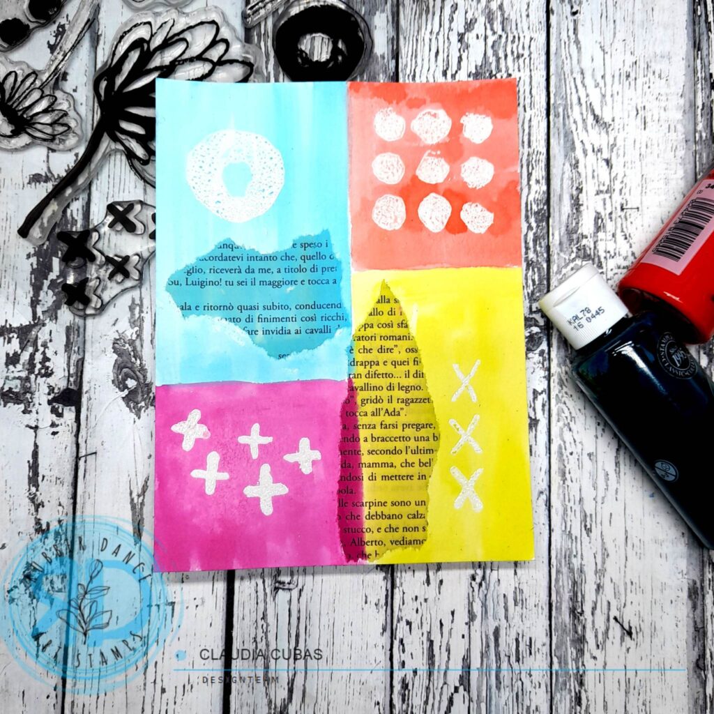 For the background, I printed some elements from the set Pencil Marks 6 with white embossing and I colored with acrylics mixed with lots of water, creating rectangles in the sheet, with four different colors.