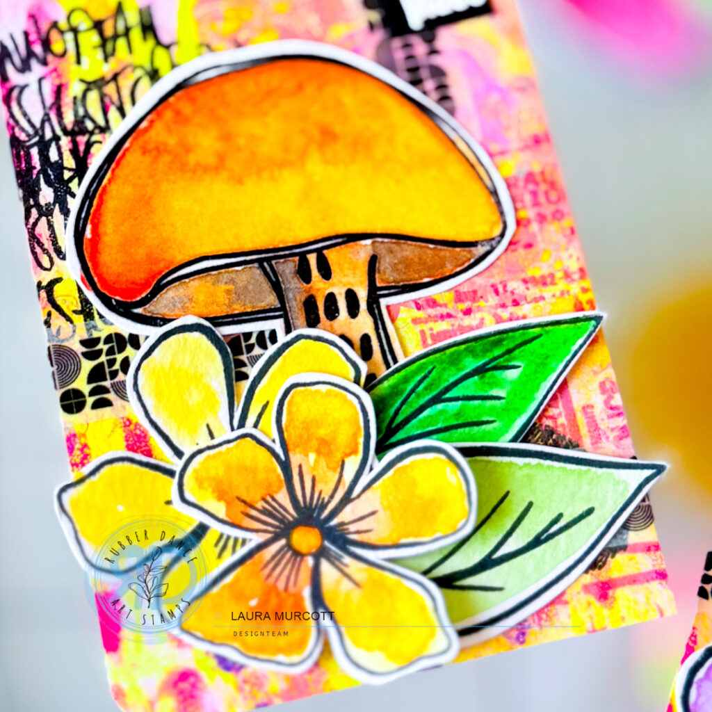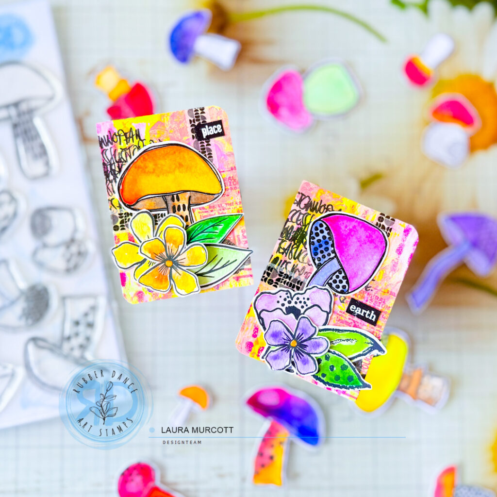 Hey! It’s Laura on the blog today and I’m sharing some bright and fun ATC’s with you using images from Textured Mushrooms 2 and Loose Florals! I hope these give you some inspiration to get creative.