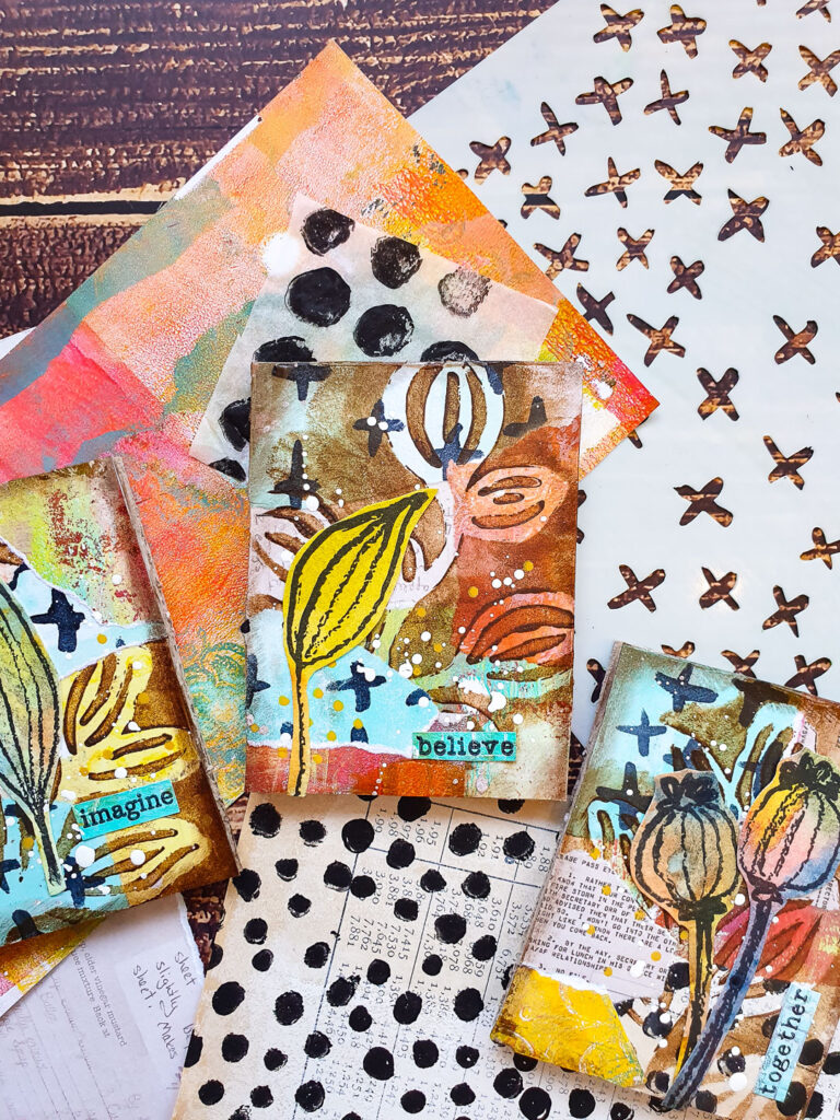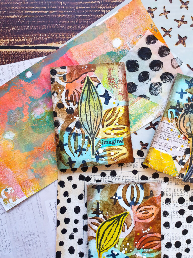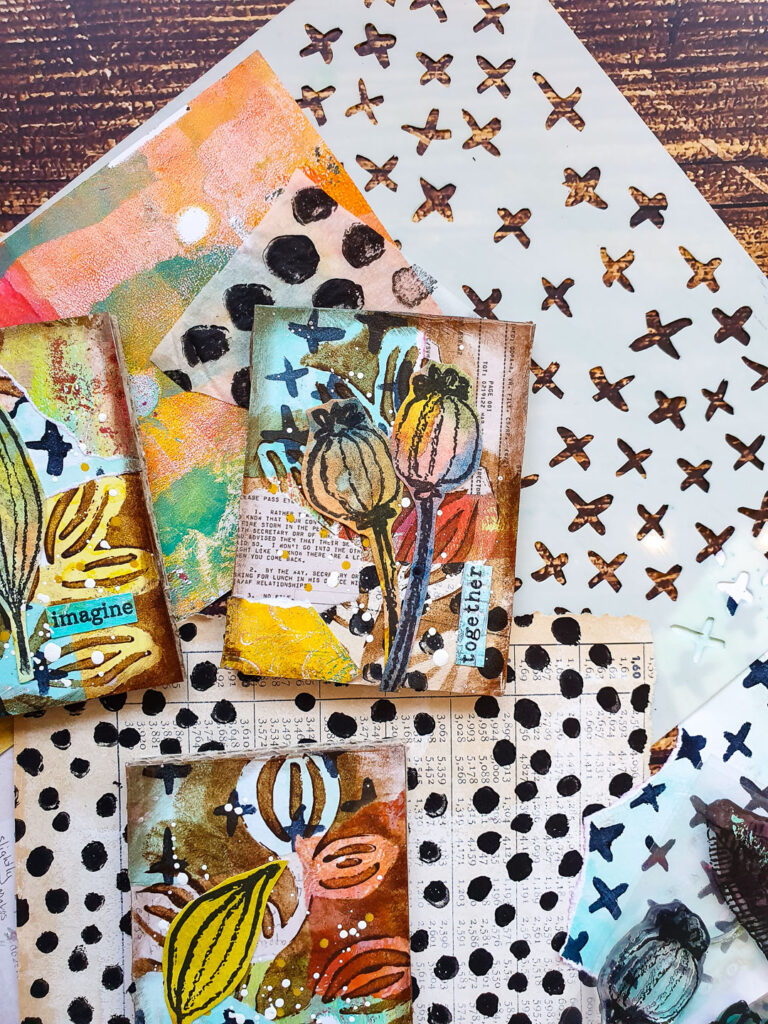 Hi there, Susanne here! I’m sharing an ATC trio today made with a cardboard base. Cardboard works great for artist trading cards and it’s a good way to up-cycle stuff, you wood normally throw in the bin. I added some collage and stenciling on the background, added some more mark making and a focal image from our Pencil Marks 5 stamps. Scroll down for a full video tutorial.