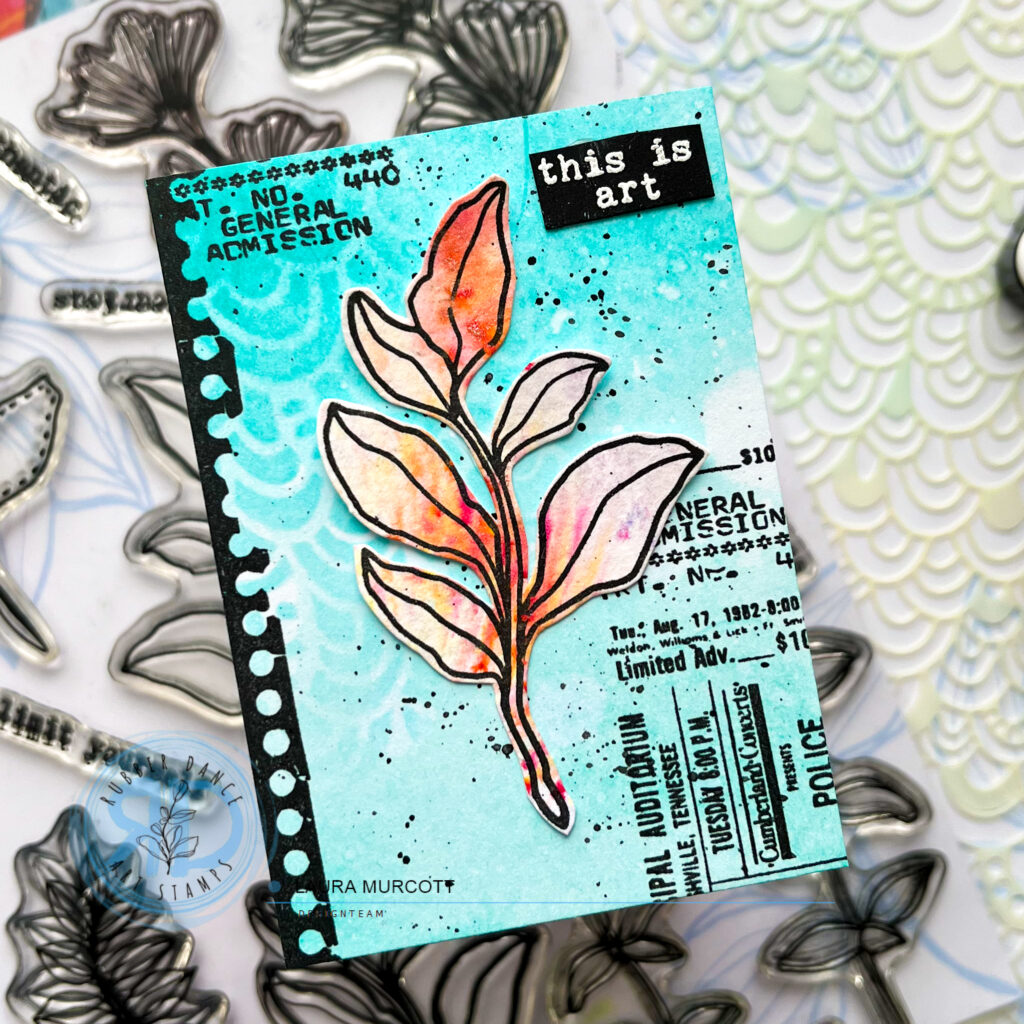 Next I added some stamping. I used the ticket stamp from the Mixed Media Marks 1 stamp set and I added a border using the Mixed Media Borders stamp set. I added some black splatters too. My focal images are from the Collage Leaves stamp set. I stamped them on watercolour card and used shimmer powders. I then fussy cut them out and attached them to my ATC along with a small sentiment which was white heat embossed on black cardstock.