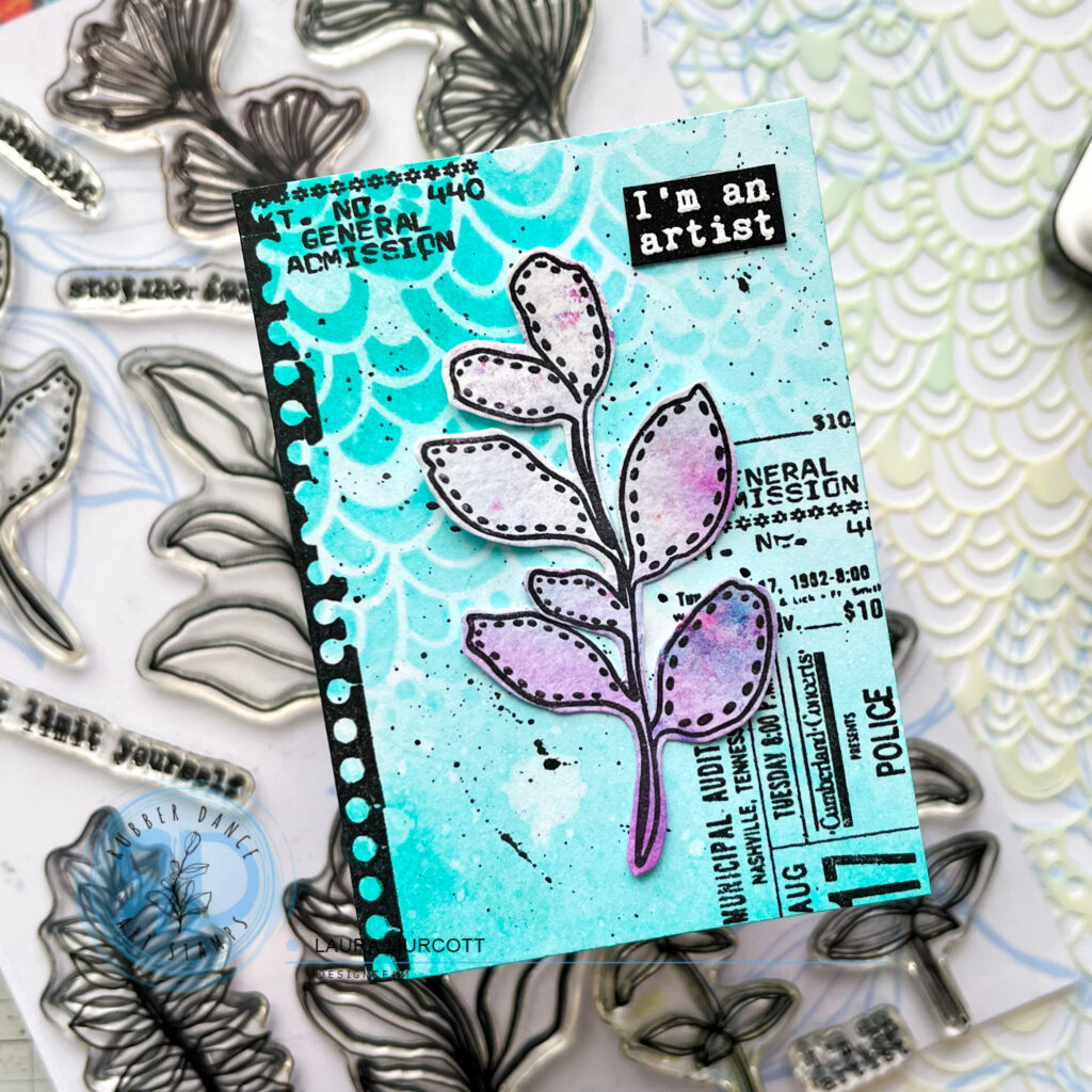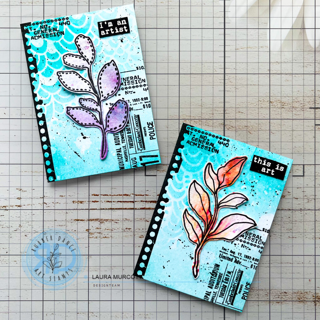 Hi! It’s Laura on the Rubber Dance Blog today and I’ve got a nice and easy inspiration post for you creating two mixed media artist trading cards using stamps from the Collage Leaves set as focal images. The background is made with the Rainbows 2 stencil combined with stamping inks.