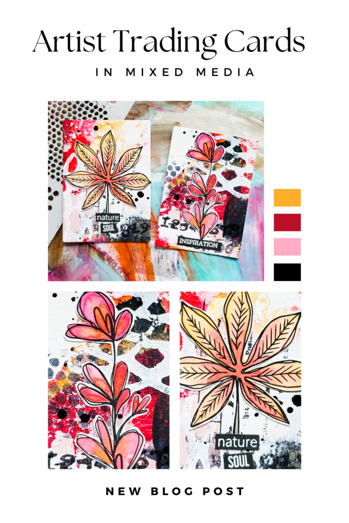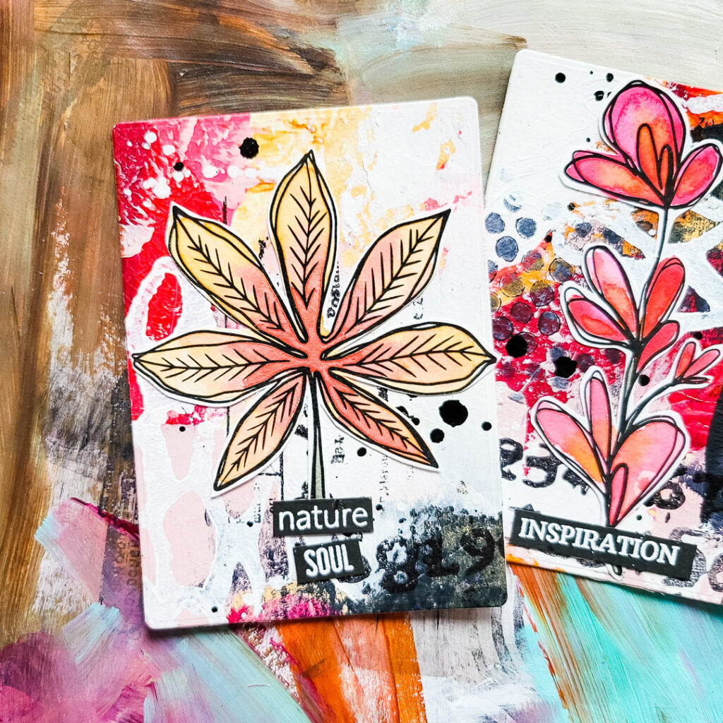 Hi there, Susanne here! I’m sharing a set of two mixed media artist trading cards using stamps from our brand new Collage Leaves 2 set. The card base is cut from a masterboard that I created in mixed media. I started the masterboard with vinyl paints, applied randomly, did some stamping and mark making. Usually this turns out quite messy and doesn’t look like a piece of art, but once you cut it down to smaller pieces it makes a gorgeous background.