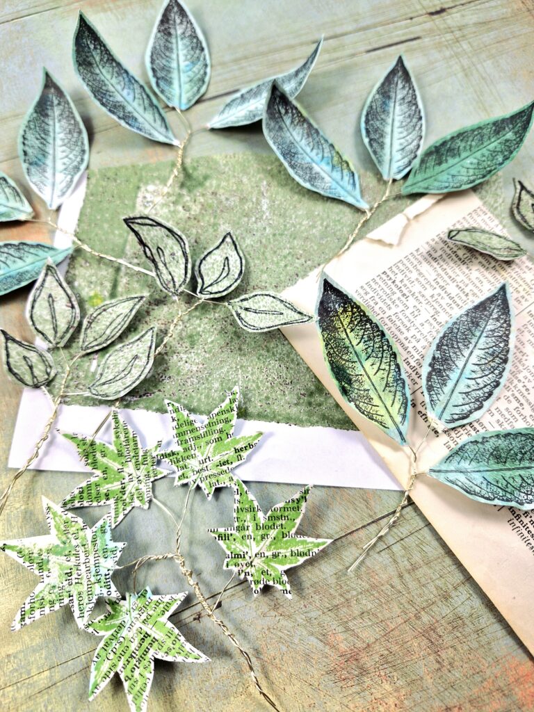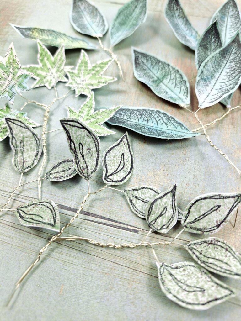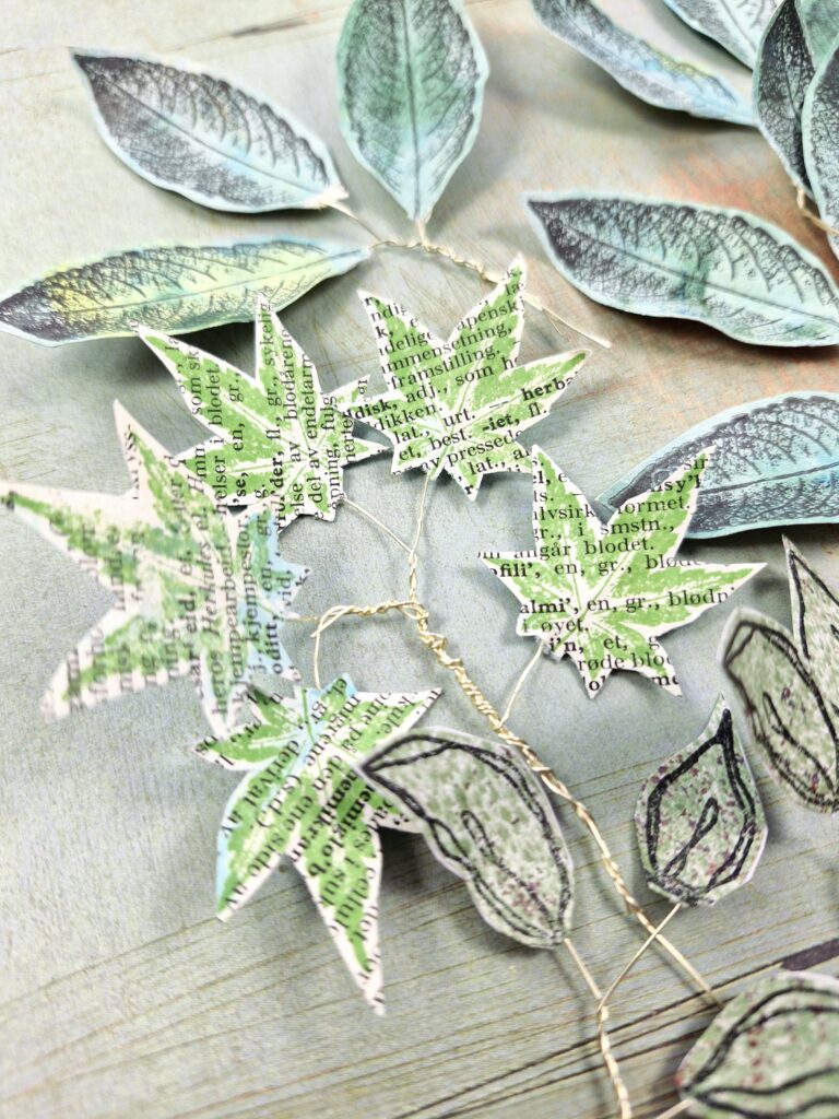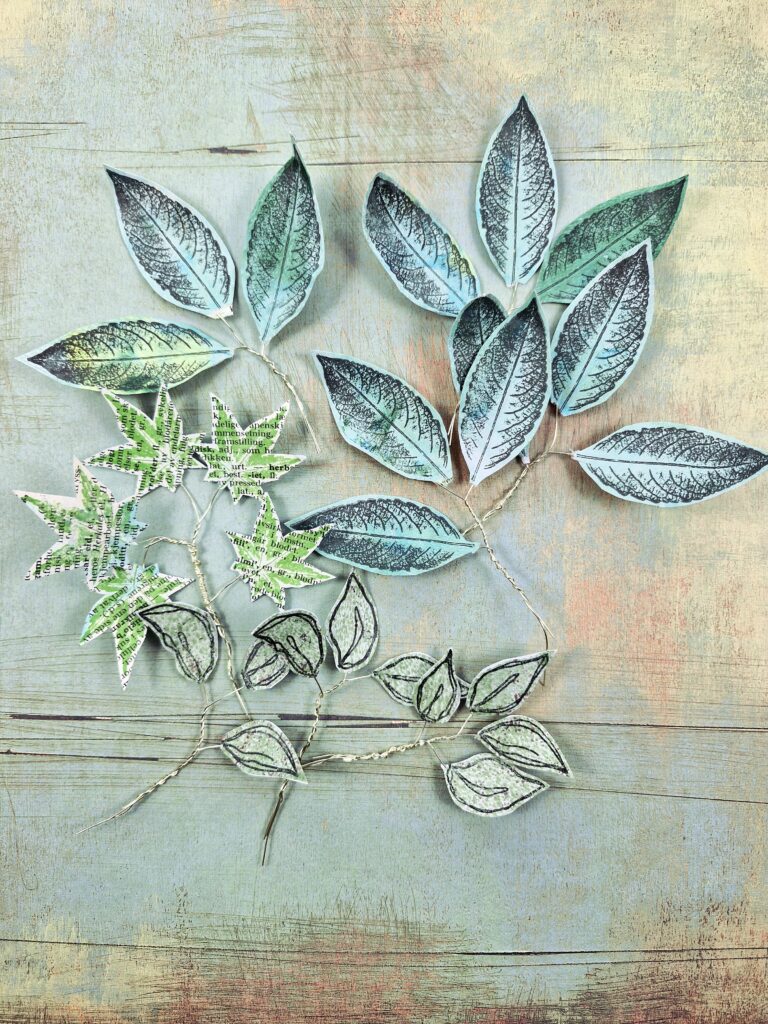 You need at least 2 sheets of collage paper – one for the front of the leaves and one for the back. Stamp leaves to one of the papers. Cut close to the bottom of the stem and turn the paper upside down. Add glue to the paper and place bits of the wire so that they poke out where the stems are stamped. Place the other sheet of paper down to to glued background. Be sure to press tight where the wire is, to assure the glue is holding on good. Then turn the “sandwich” (stamped paper + wire + back paper) around and cut out the stamped leaves. To mount the leaves together, simply twist the wires. Then the collage fodder is ready to use.