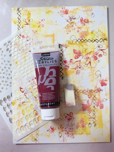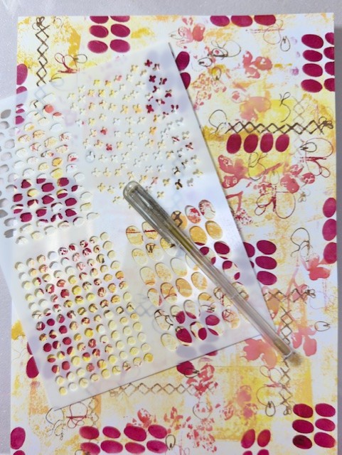 The mood board is starting to take shape! Now for some contrast with maroon acrylic paint sponged through the ovals from the Mini Textures 1 stencil. Finally, I used a gold gelly roll pen with the little cross stencil design to add a tiny bit of bling!