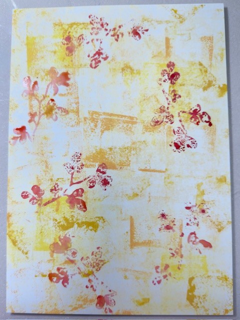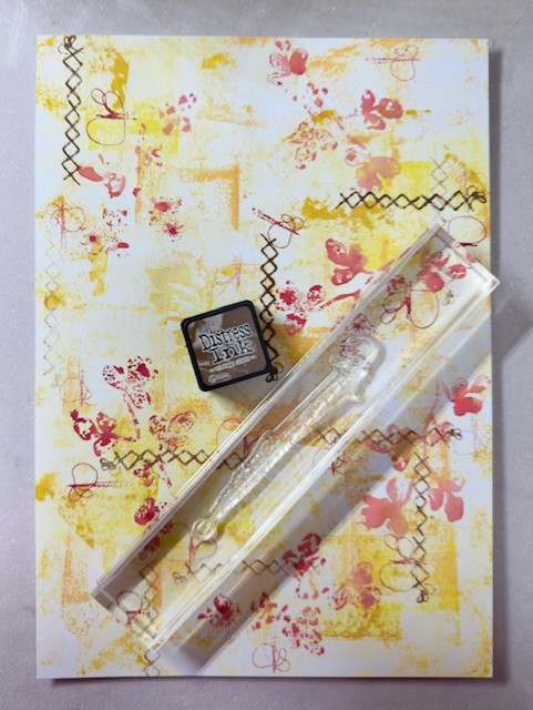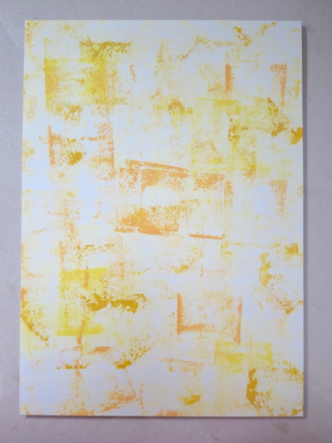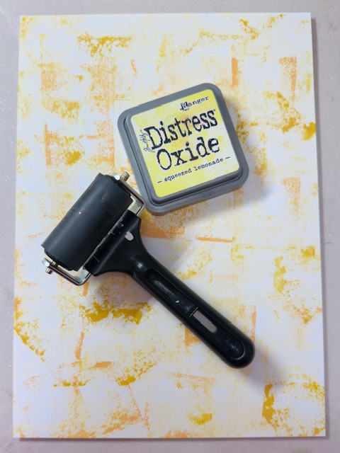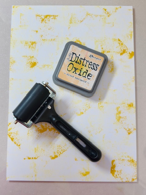 To start I used a brayer randomly to add 3 complementary shades of Distress Oxide inks to a sheet of white card.