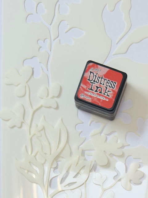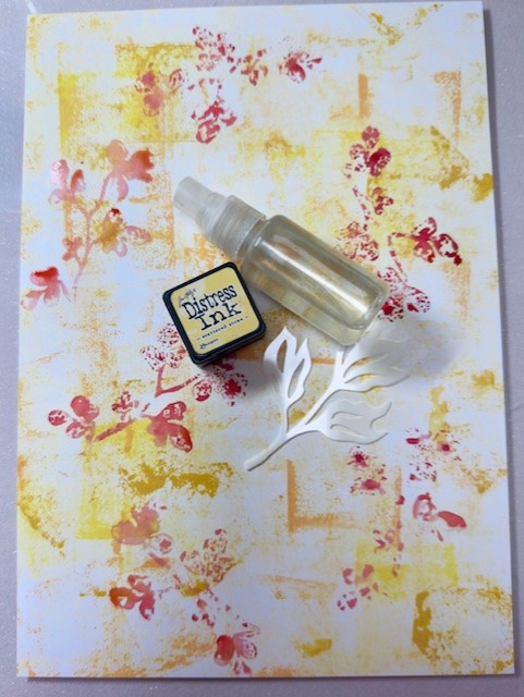 Then I used Distress Inks with the Sketchy Leaves 7 stencils set – rubbing the ink pad against the mask and spritzing with water before “stamping” with the mask onto the background.