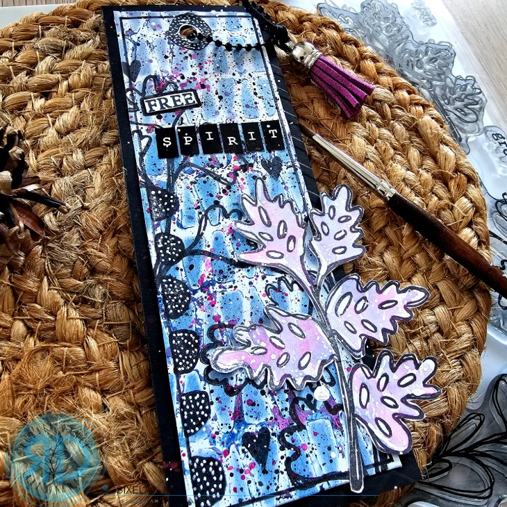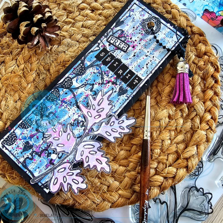 It’s Sixela on the blog today. To make this bookmark I used the Rubber Dance Collage Leaves 2, Pencil Marks 7 and Doodle Flowers 2 stamps with the Small Triangles stencil.