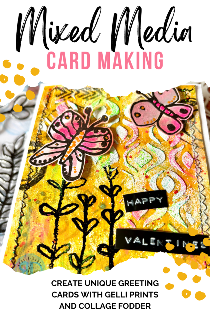 Mixed media greeting card with gelli plate background and ornament 1 stencil