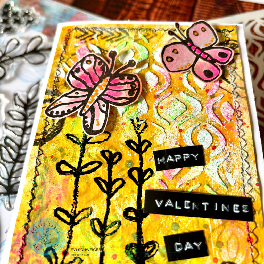 For this Valentine’s card I used a background that I had made with the Ornament 1 stencil on a gelli plate. I stamped the leaves from Pencil Marks 1 on it and heat embossed them in black. Then I added black accents with the Pencil Marks 8 stet and stamped and coloured the butterflies from the same stamping set on white cardstock.