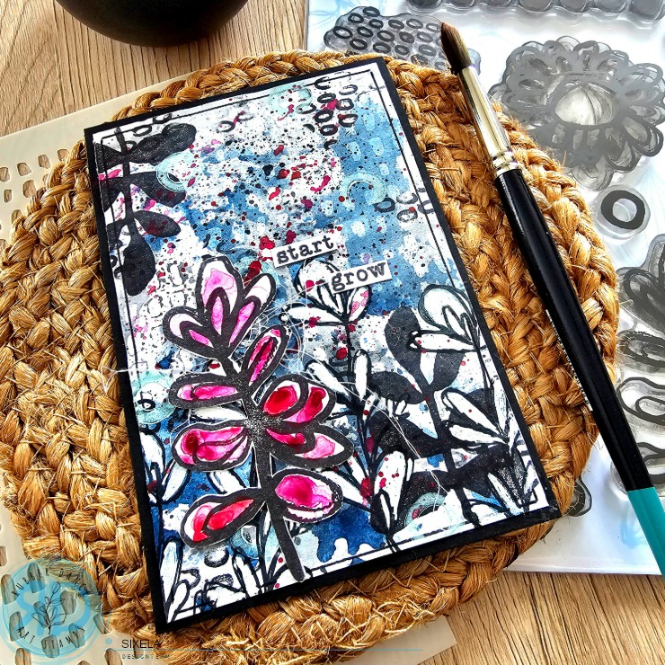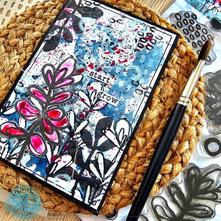 I stamped flowers from the Collage Leaves 2 board on white paper, then cut them out and glued them to the bottom of the card. I did the same with a flower from the Pencil Marks 7 board, then I colored it with watercolor and I also made stains on the rest of the creation. And finally I added the start grow text Collage Leaves 2.