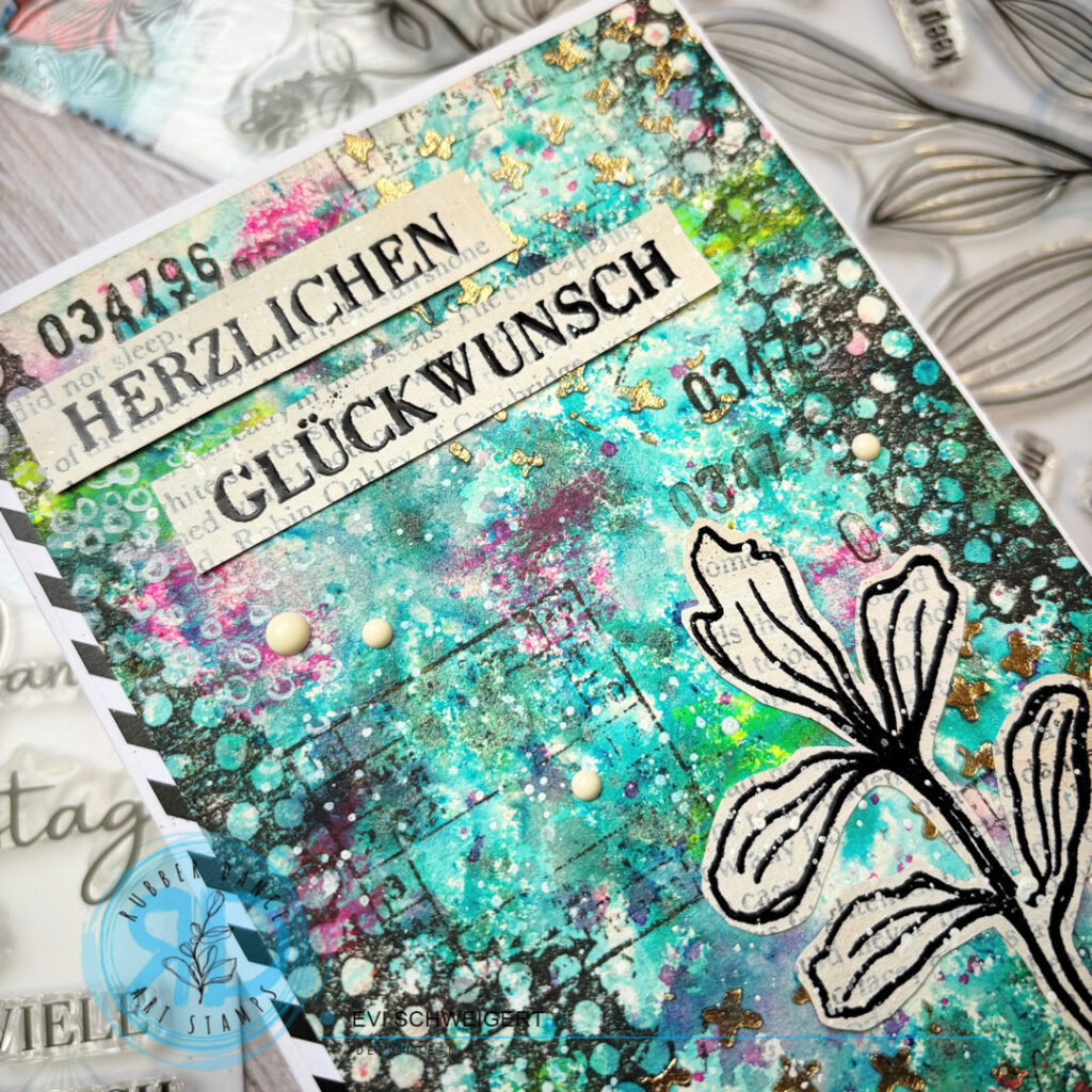 For this card, I created a mixed media background using various stamps and stencils. Once you get started, you just can’t get enough.