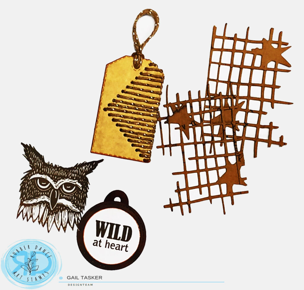 I stamped the owl and the ‘wild at heart’ from the same set with brown archival ink on white card. I fussy cut the owl and used a die to make the wild at heart into a tag to use as my title. I cut a tag from kraft card and I used a hole die and then threaded through the brown and gold twine. The star net die is from Dixi Crafts