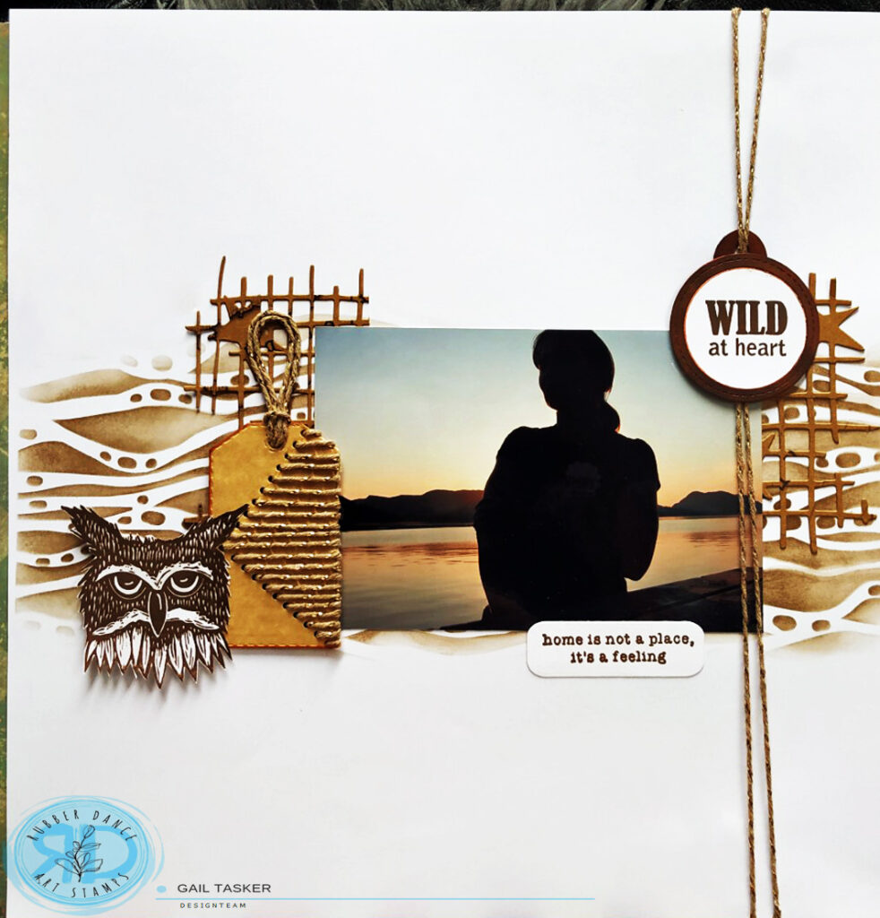 Hello Rubber Dance friends. Gail here today and I want to share a layout I have made using Rubber Dance Carved Fox and Owl stamps and the new Organic 1 stencil.