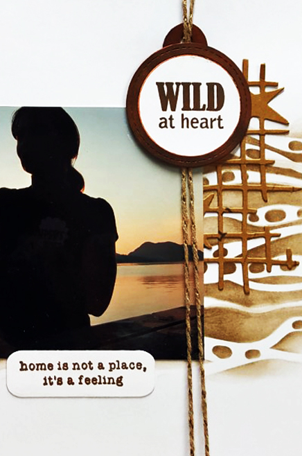 I arranged everything in a pleasing manner, adding the ‘home is not a place, it’s a feeling’ from the Happy Place stamp set. I used more of the brown and gold twine to suspend my Wild at Heart tag. The picture is me watching sunset over the fjord.