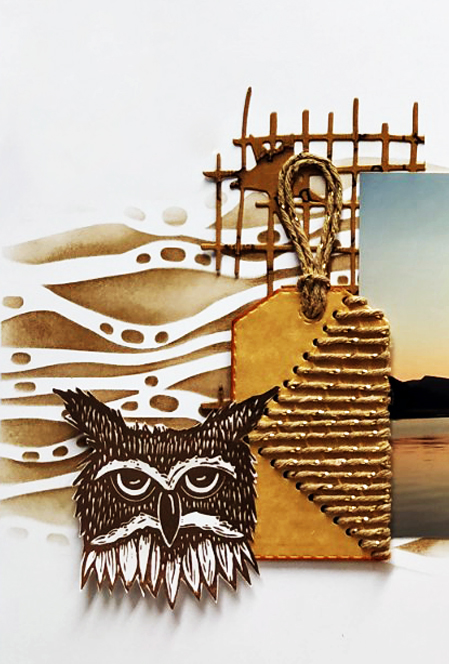 I am guest designing with this layout over at White With 1 today. I play along with their challenges in their fb group and they selected my May layout as the admin’s choice. The moodboard this month is shades of brown and add a tag. Their moodboard also has an owl so that inspired me to use the Carved Fox and Owl set. I used the lovely Organic 1 stencil. in the background to give a beautiful horizontal flow to the layout.