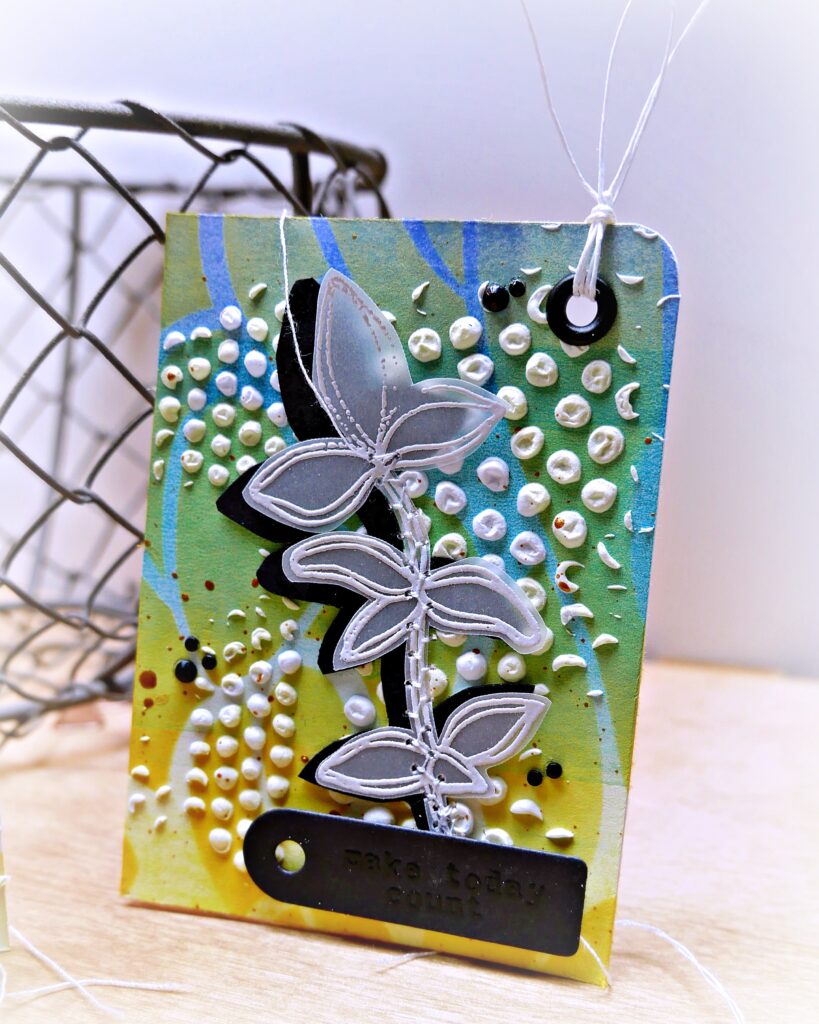 I embossed the leaves on vellum and embossed the Mix A Sentiment 2023 font stamp in black on black for the background. A very cool effect, in my opinion. What do you think?
