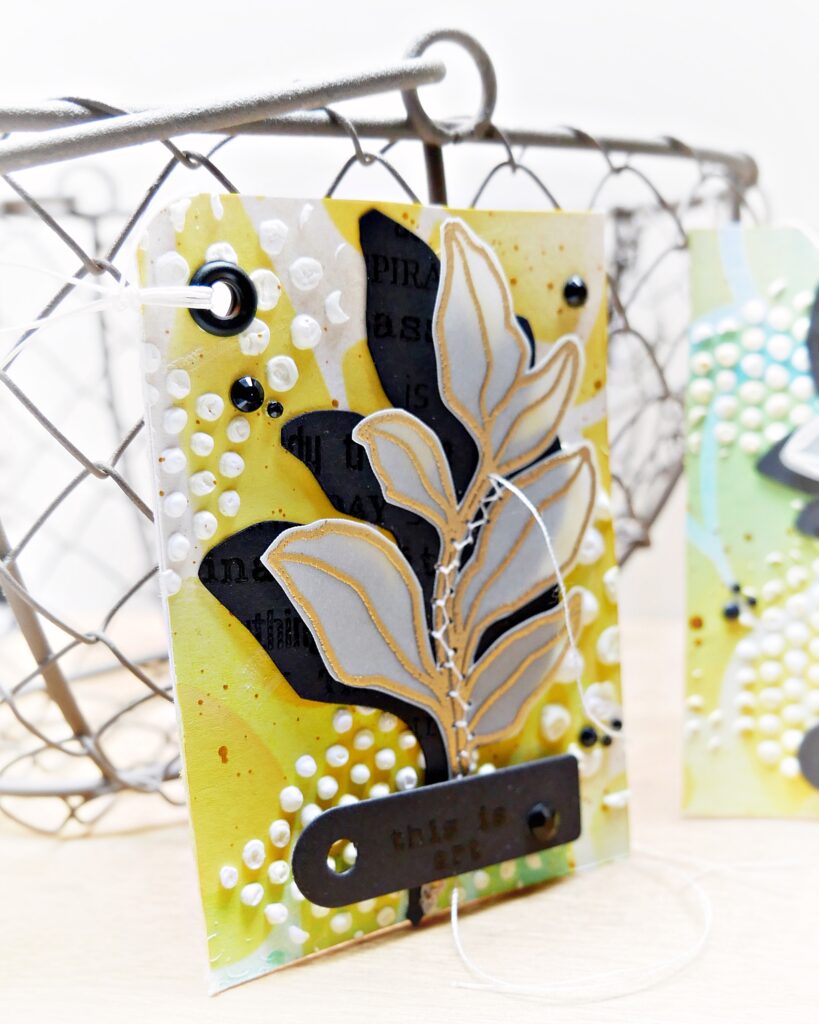 These Mixed Media Cards where made from a gelprint that I had already in my stash – and of course, there are tons of them :)) I’ve used the stencil Organic 3 with Distress Oxide Inks on the Gelprint and added another stencil, the Mini Ink Dots with some modelling paste. After that I found out, that the stencil Sketchy Leaves 2 is a perfect match to the stamp set Collage Leaves – sometimes I seem to notice things late, lol