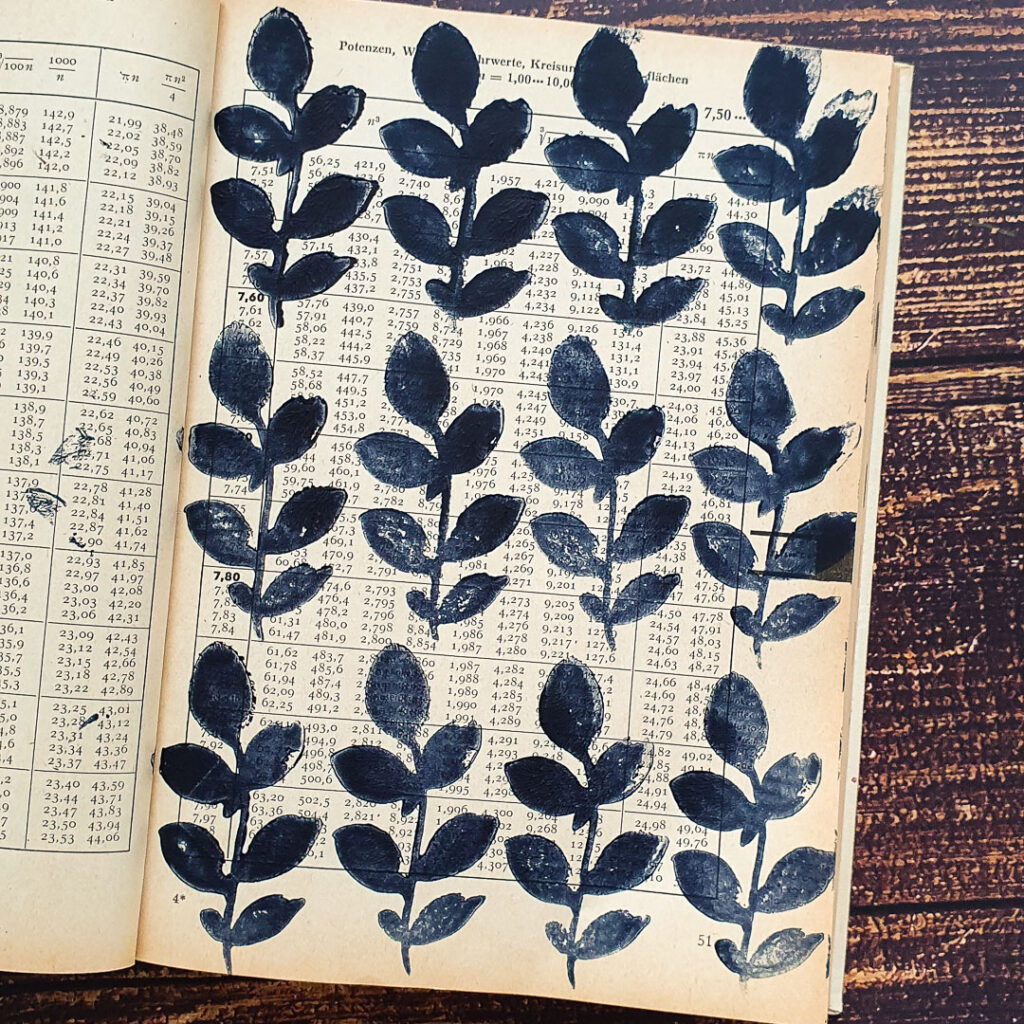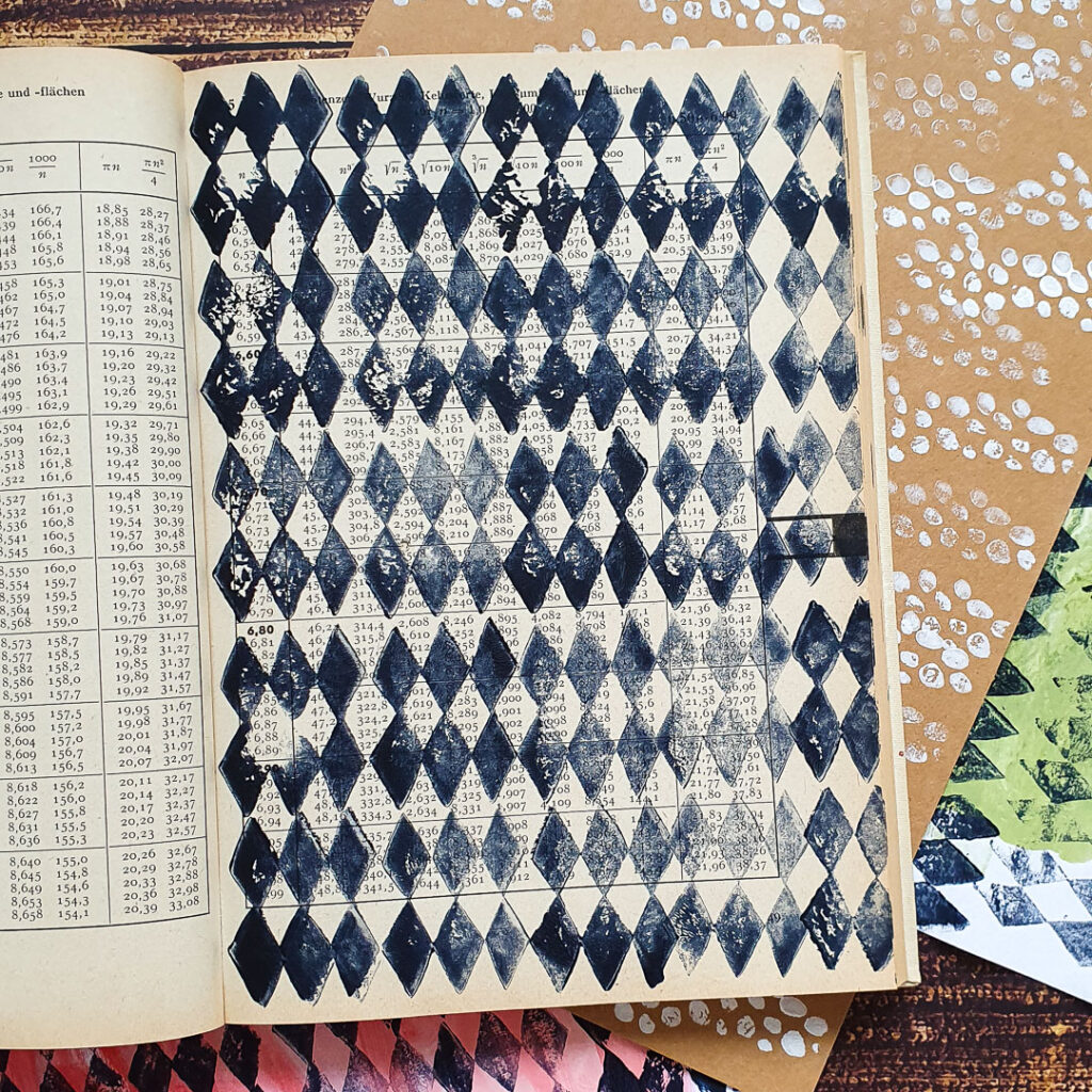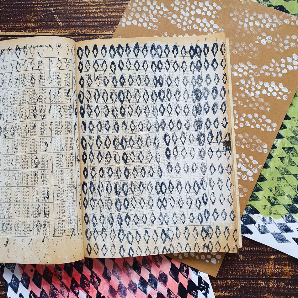 Hi everyone, Susanne here today. I wanted to share a nice way on how to create and store collage papers using an old book and some mark making stamps. I recently went to a book-market and grabed a very old maths book. The pages are full with numbers and because of their age they already have this yellow/brown color. I thought they are perfect to use as collage papers.