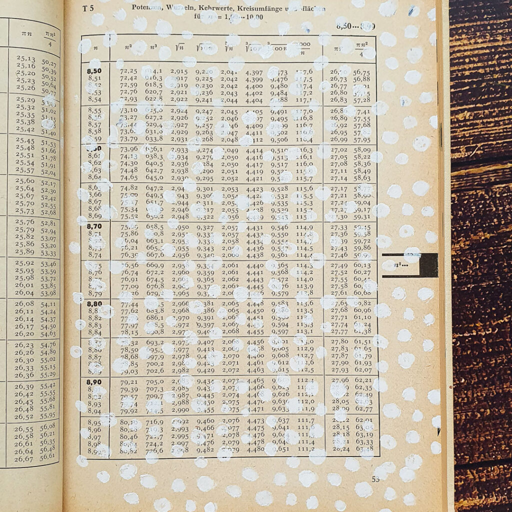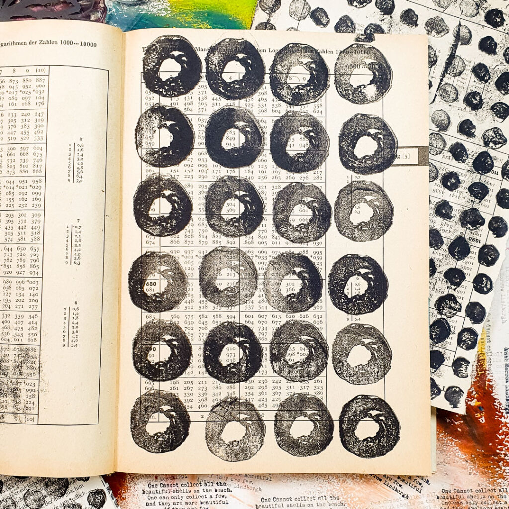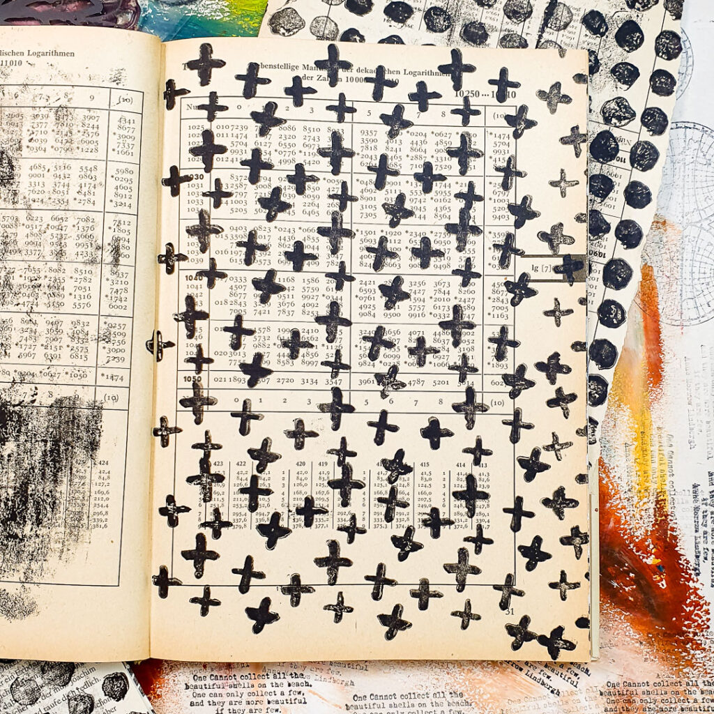 Hi everyone, Susanne here today. I wanted to share a nice way on how to create and store collage papers using an old book and some mark making stamps. I recently went to a book-market and grabed a very old maths book. The pages are full with numbers and because of their age they already have this yellow/brown color. I thought they are perfect to use as collage papers.