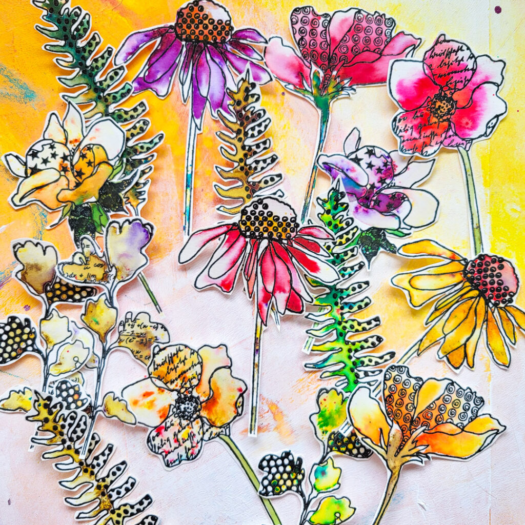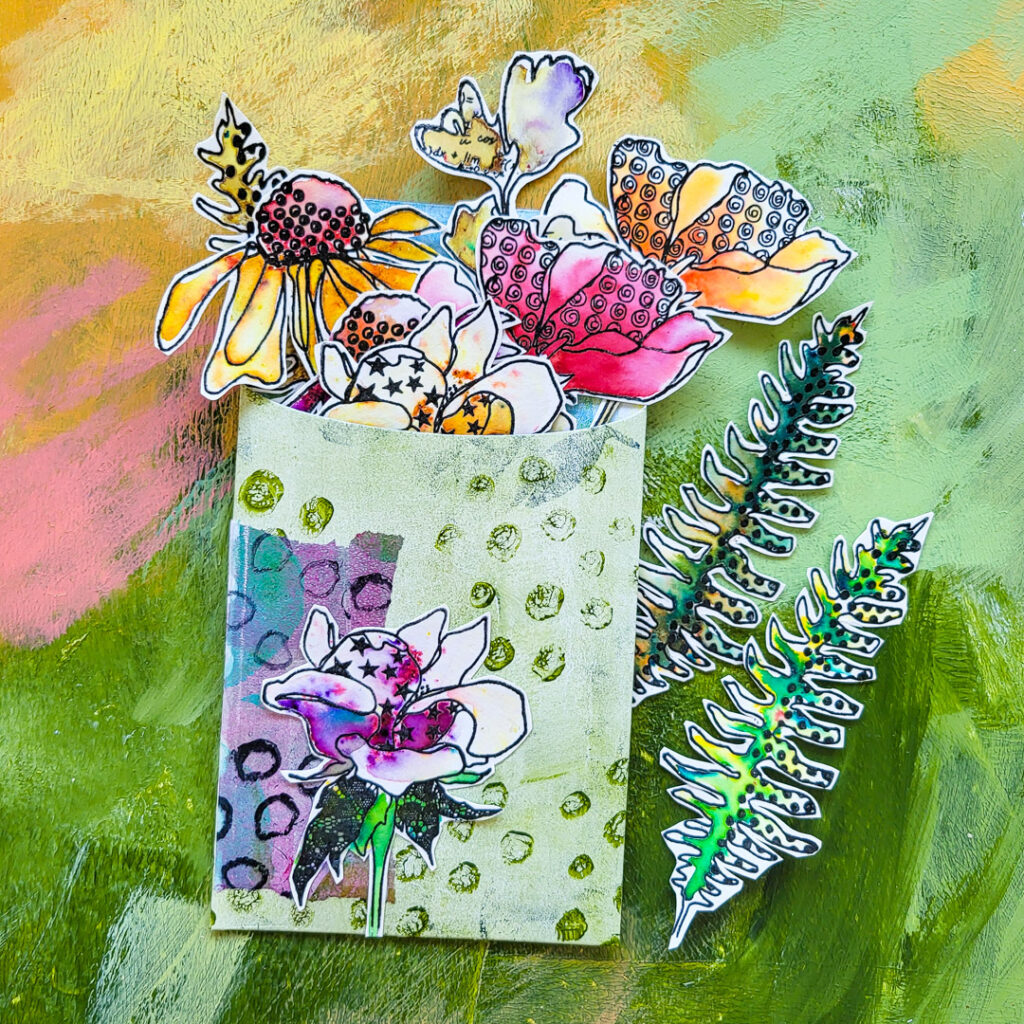 Hi there, Susanne here with a fun way on how to store or gift your handmade collage fodder! I cut an envelope using a die from a gel print to put in my collage fodder pieces. I used one of the Doodle Flowers 2 to decorate the envelope and also used images from this stamp set as my fodder.