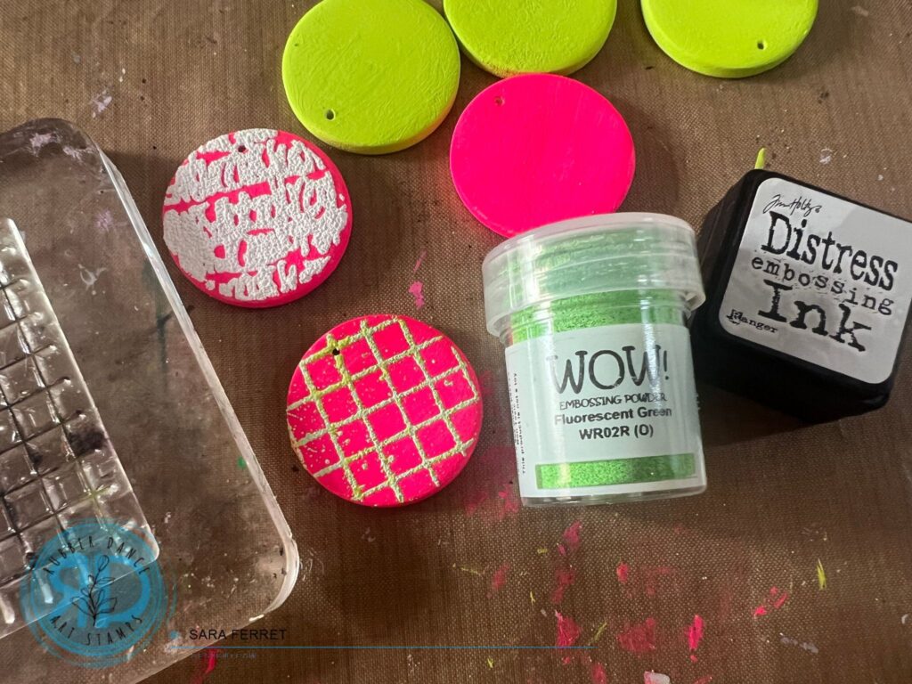 I used a different stamp on each piece from the Mixed Media Marks 1 stamp set, with different embossing powders. I am using Distress Embossing Ink, any Embossing Ink will work.
