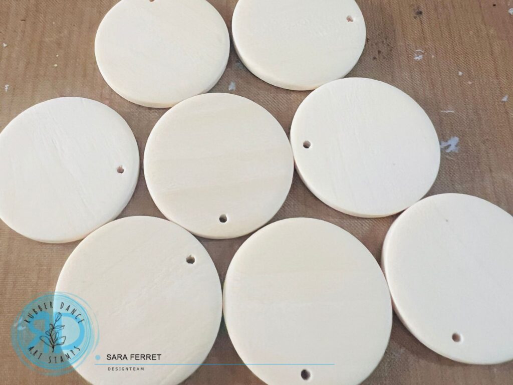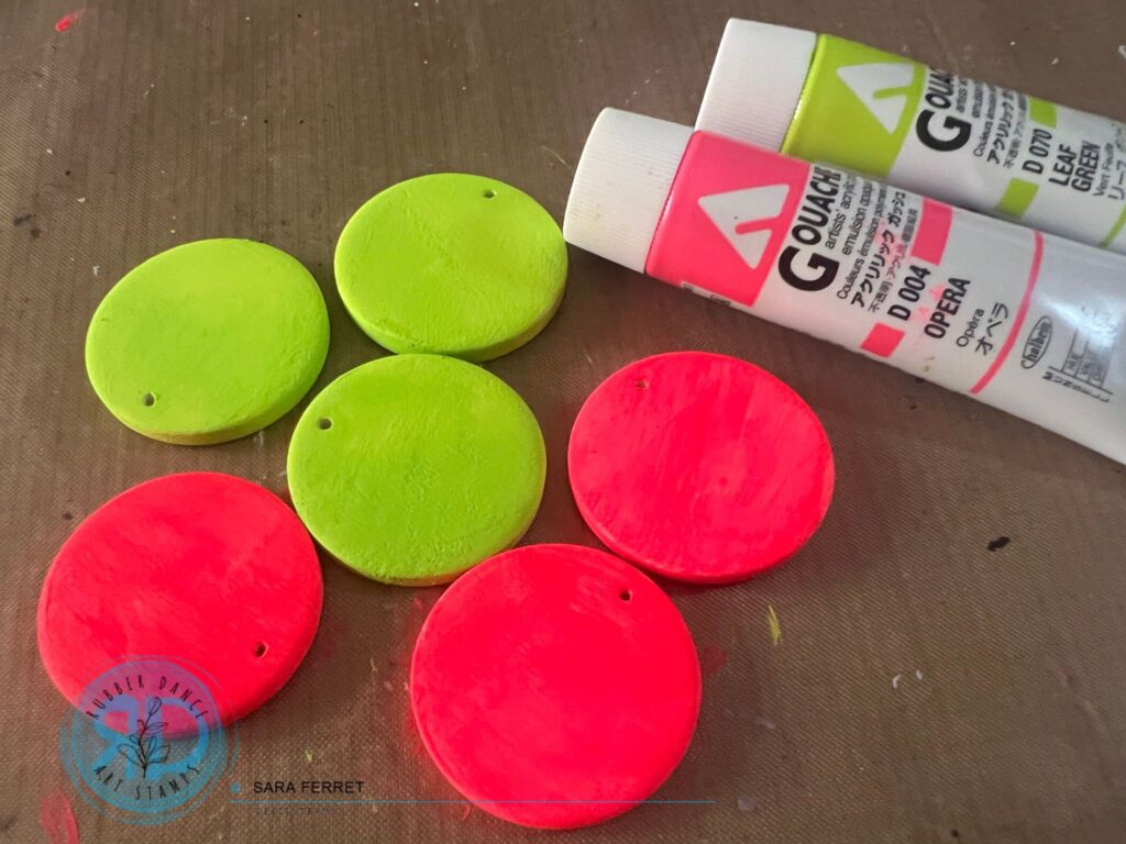 I started with some wood rounds with a hole. I painted the background with pink and green acrylic gouache. Of course you could also use acrylic paint instead!