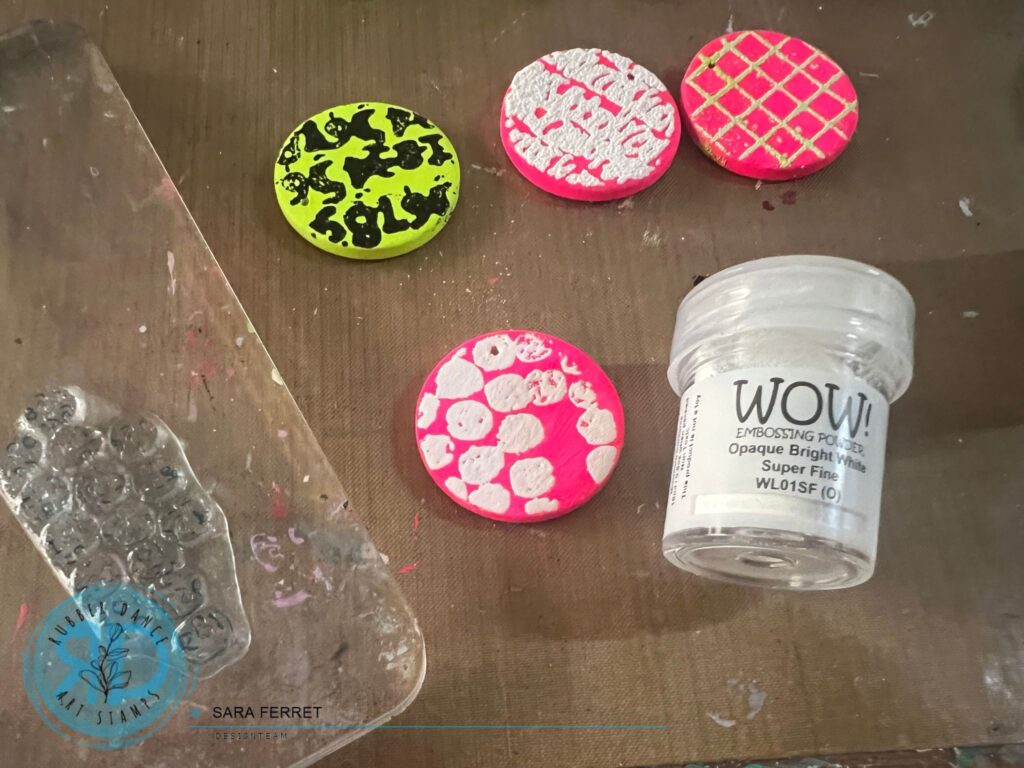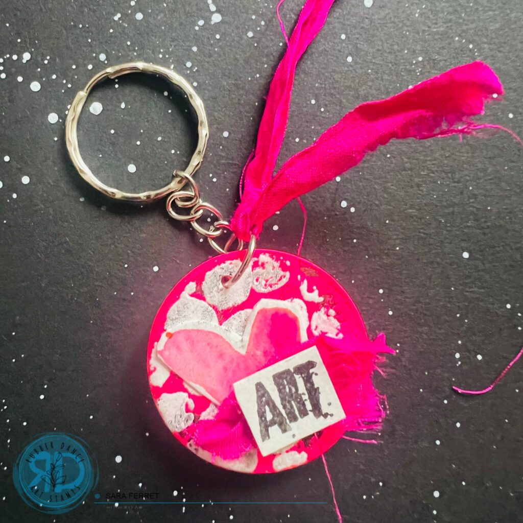 If you like to, you can embellish the elements with some collage fodder. I paint some hearts with watercolor, and stamped some circles and watercolors. I also stamped the word ART and used some Sari ribbon to decorate the key chains.