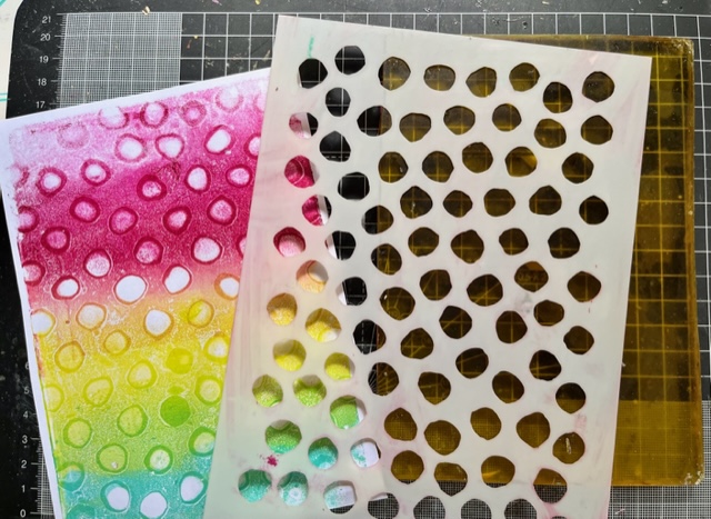 Today I thought I’d make a little sign to hang in my hallway. I started by creating a gelli print background with the gorgeous Ink Dots stencil. I often make these backgrounds by putting 3 complimentary colours on my gelli plate (the lightest one in the middle so I can blend it with the ones either side).