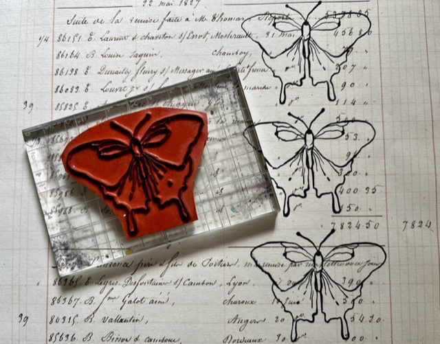 I stamped the butterfly several times on some ledger paper and cut them out.