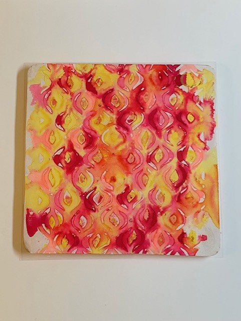 When you are happy with your design, carefully peel off the stencil and quickly put it face down on a piece of paper to take a print of the alcohol inks whilst still wet.