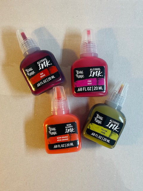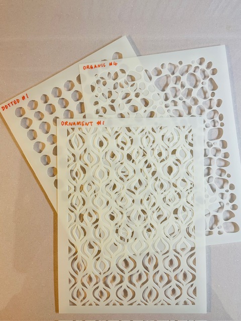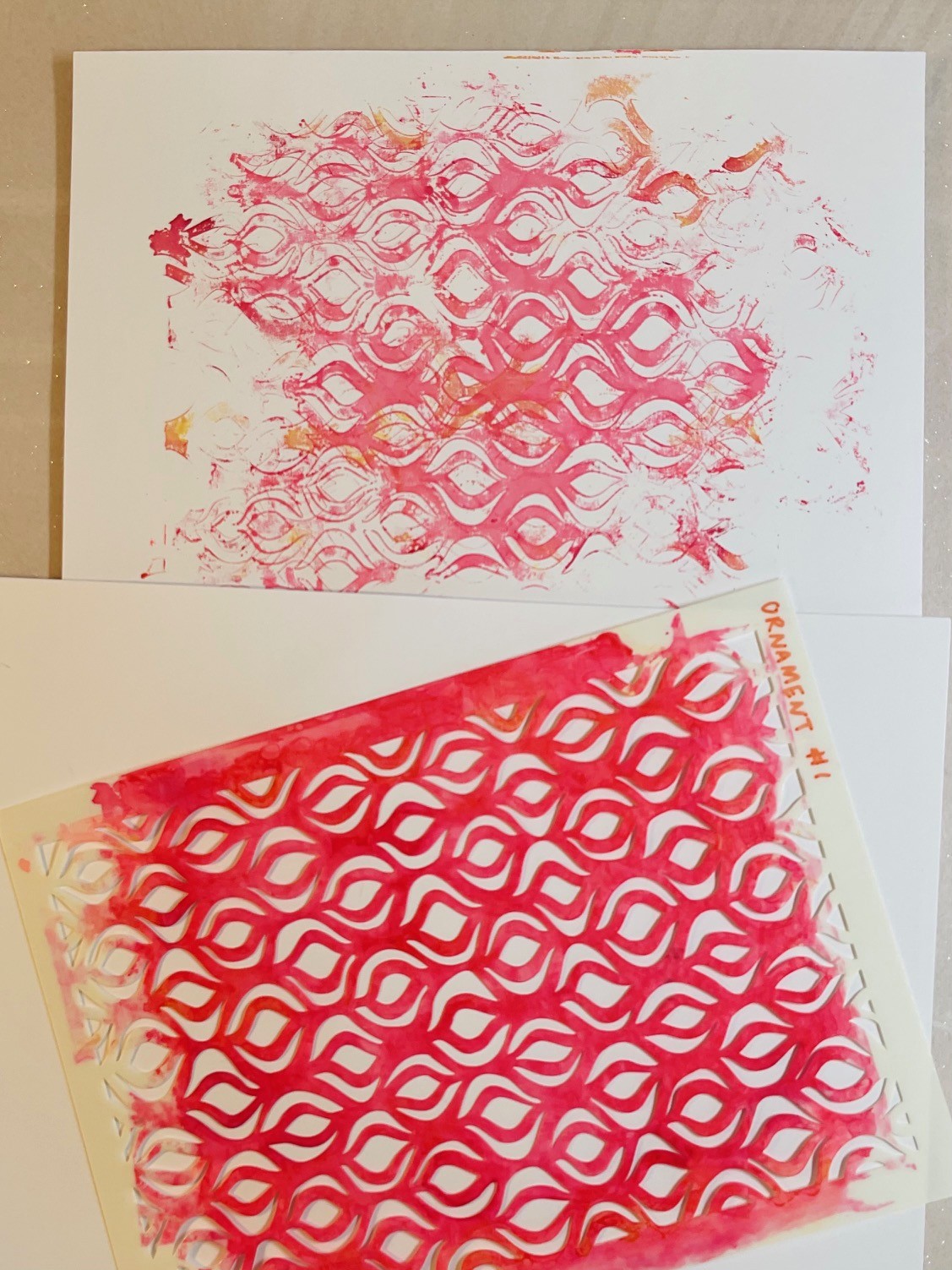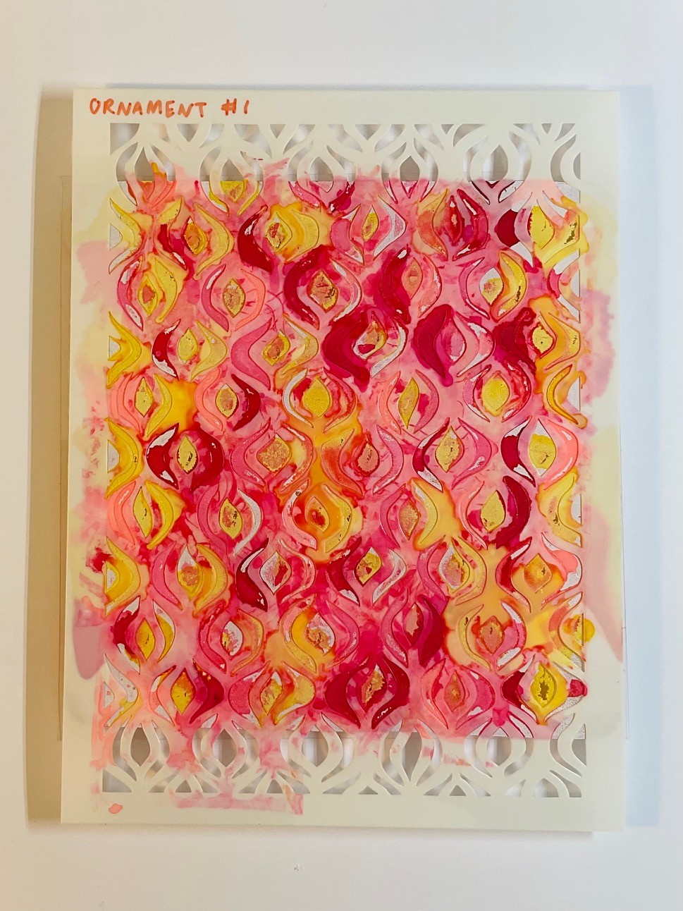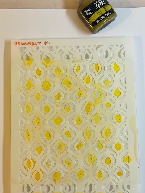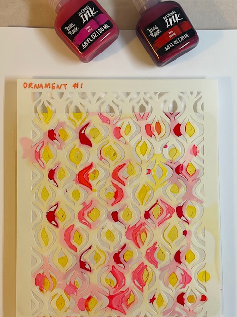Then add droplets of alcohol inks to fill in the gaps in the stencil. Here’s pictures using stencil Ornament 1