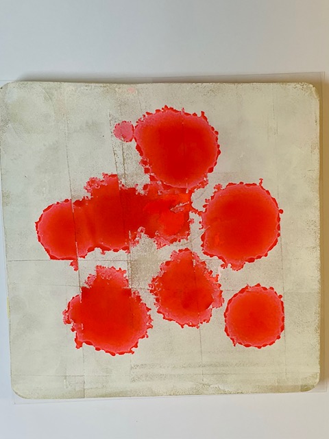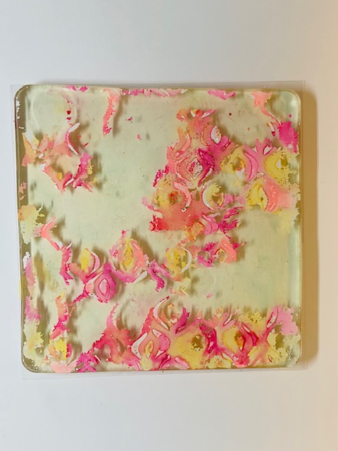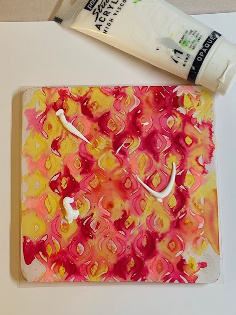 Alcohol inks dry pretty fast. When the inks are dry on the Gelli Plate, brayer on a thin layer of acrylic ink – I used white to keep the colours vibrant.