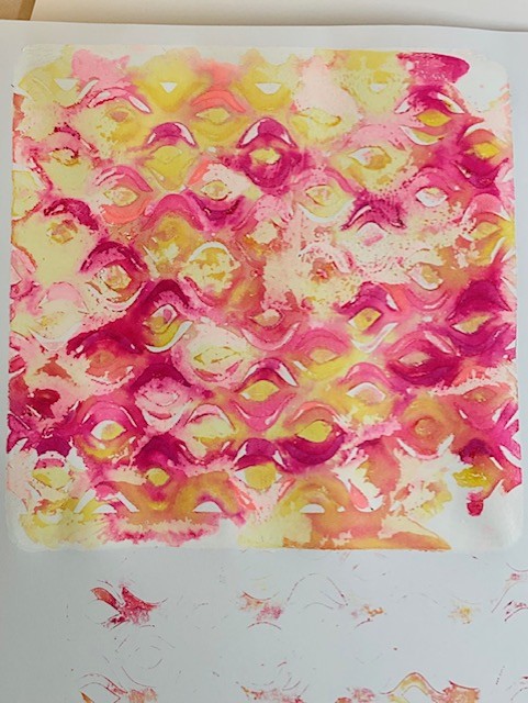 Personally, I like to do some simple, monocolour prints so that I have several complementary prints to work with.