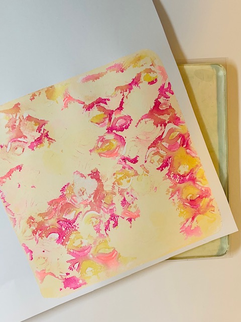 Don’t let the paint dry! Pull a print off the Gelli Plate. This first print is always the “busiest” with lots of detail.