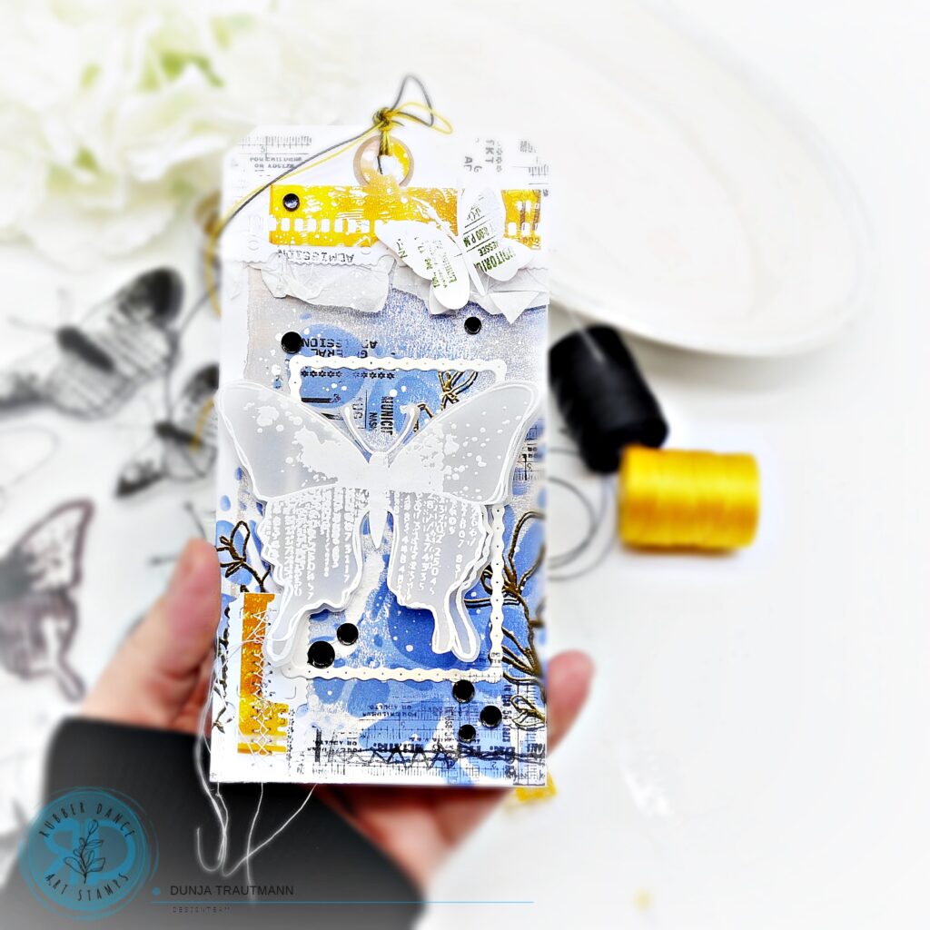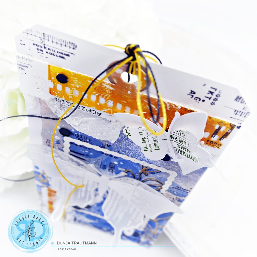 Hej there Rubber Dance’rs, it’s me, Dunja, today on the blog sharing a TAG with the fabolous Grungy Butterflies 2022, embossed on Vellum and some Gelprint Papers from my stash. I am building up dimension by adding different bits and pieces of cut or torn papers and some die cuts.