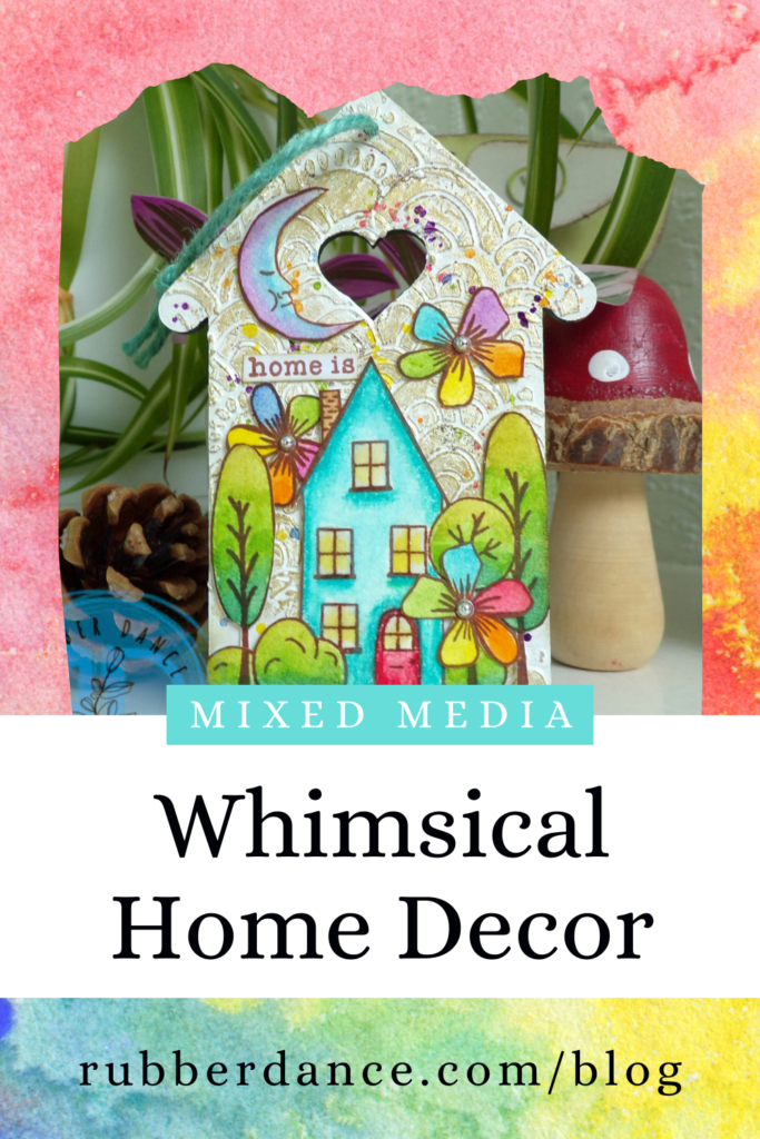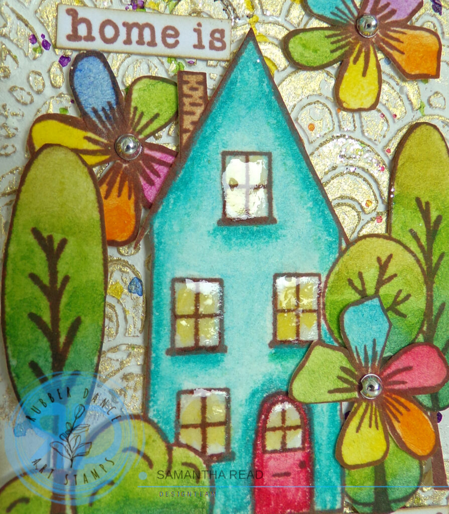 I began by applying texture paste through the Rainbows 2 stencil and when dry I painted with white gesso and a final coat of ivory paint. There are splashes of watercolour paints and some glitter too. The moon (Celestial stamp set), flowers (Loose Florals 1), house (Happy Place) and text were all stamped on white card and adhered in place. I coloured the images using watercolour paints and Prismacolour pencils. Finishing touches were gems to the flower centres, glossy accents on the windows and the twine for hanging.